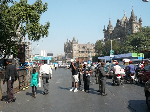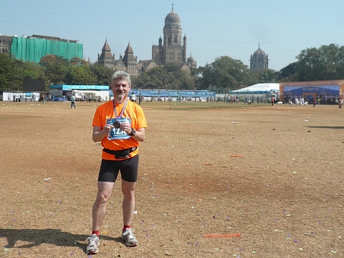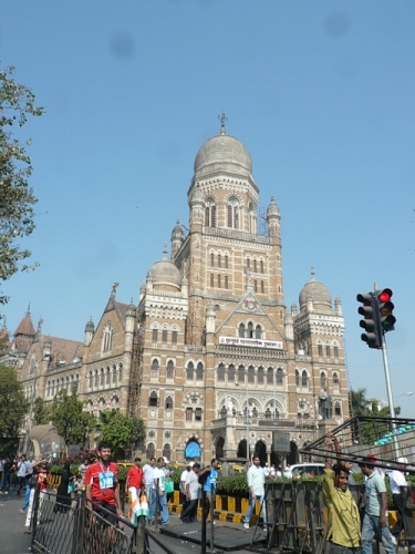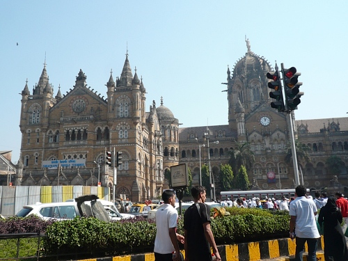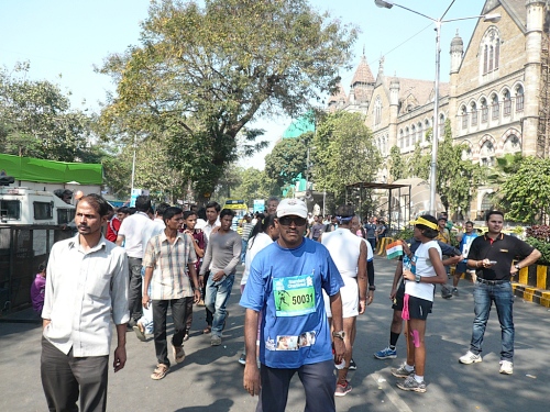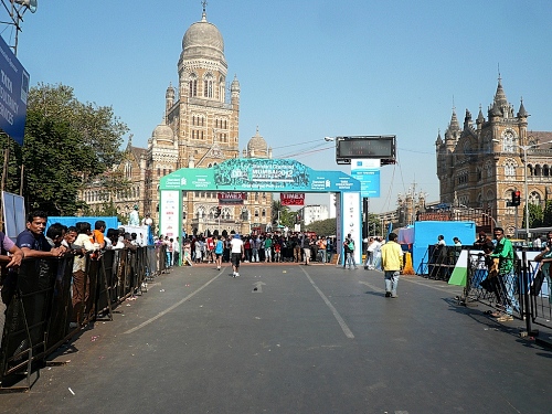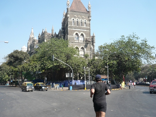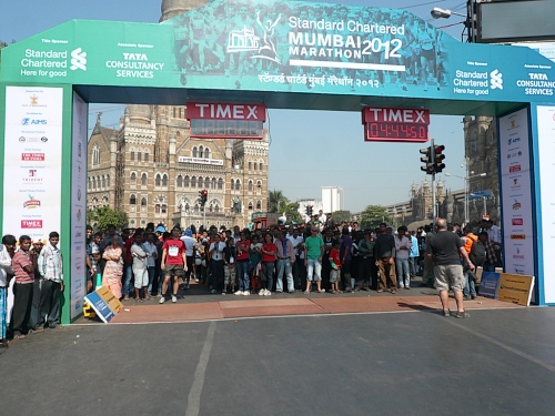 Pünktlich um 05:40 erfolgte der Start für die normalen Läufer. Normale Läufer sind alle, die langsamer als drei Stunden sind. Schön ist auch hier, dass es für die Ziel-Zeiten 4:30, 5:00 und 5:30 jeweils zwei Pacer gibt. Es geht los direkt neben dem CST Building (direkt bei der ehemaligen Queen Victoria Station). Im Dunkeln sehen wir links neben unserem Starttor das UNSECO-Weltkulturerbe, den Bahnhof vom Mumbai (Chhatrapati Shivaji Terminus). Das Gebäude ist im Stil der viktorianischen Neogotik erbaut worden mit einem Stahl- und Glasdach. Das 1888 fertiggestellte Gebäude hat über dem Haupteingang eine begehbare achteckige Kuppel. Das Gebäude ist mit vielen Steinfiguren und Reliefs verziert.