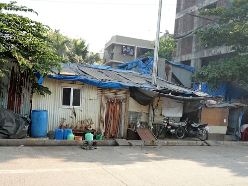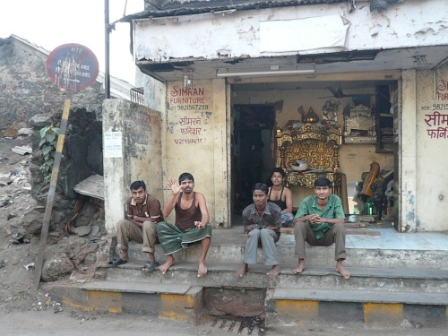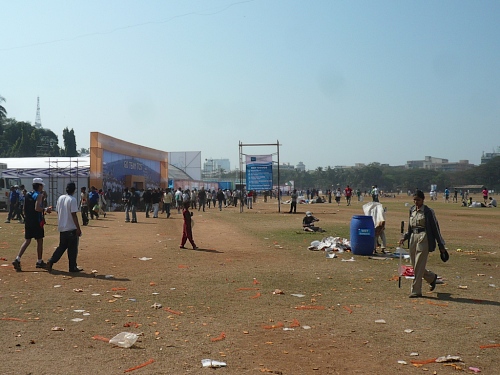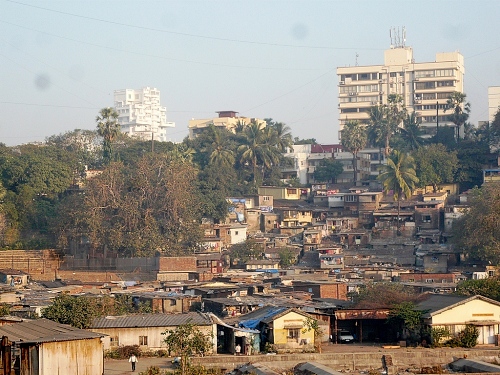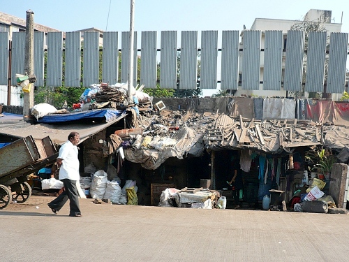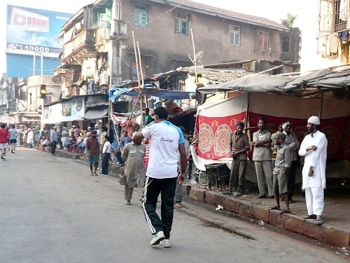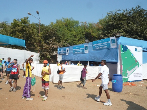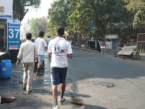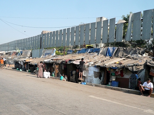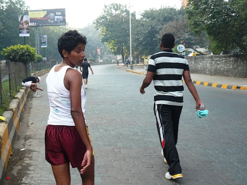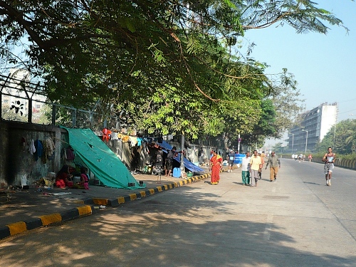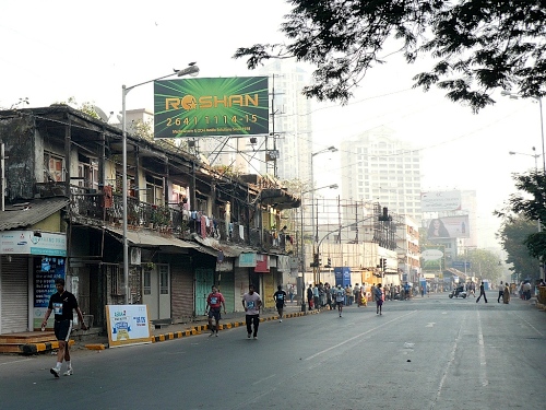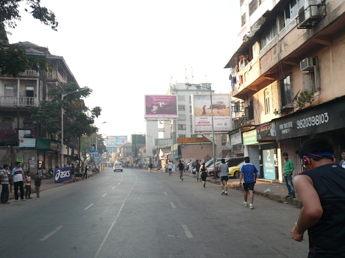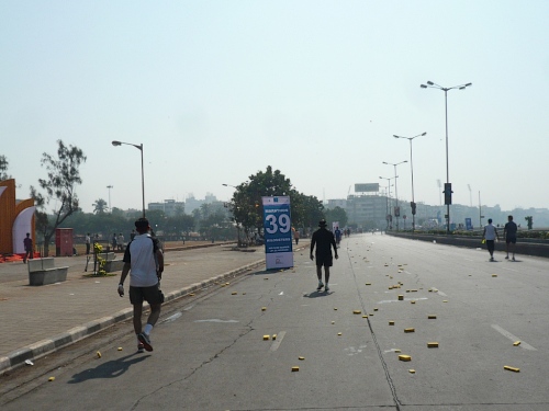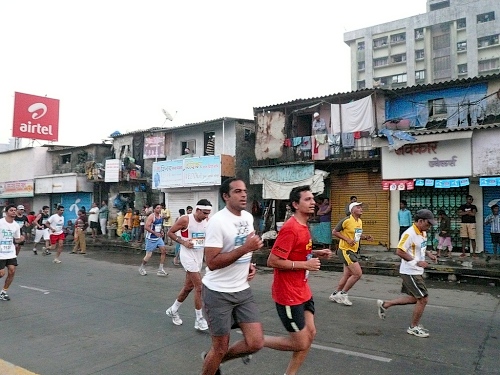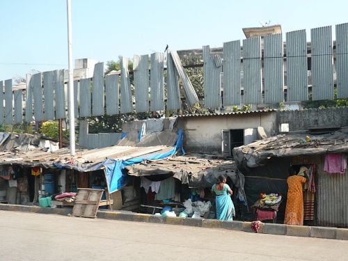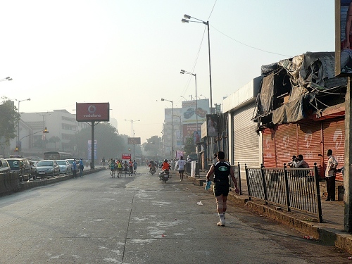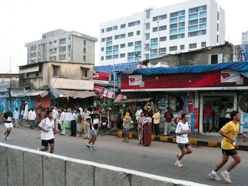 Hinter km 25 kommen wir an den Mayfair Ballsälen vorbei und erreichen den km 26, müssen jedoch jetzt noch eine Schleife laufen die uns nochmal in nördliche Richtung führt, vorbei am Beginn der Bandra-Worli Sea Link Brücke. Jetzt bleiben wir aber auf dem Festland und sehen Menschen in ihren armseligen Behausungen. Manche haben nur ein Zeltplane, andere einen Blechverschlag.