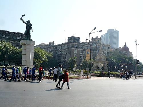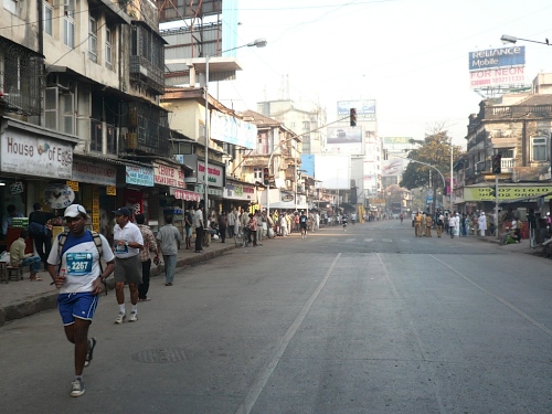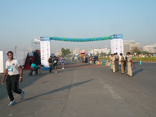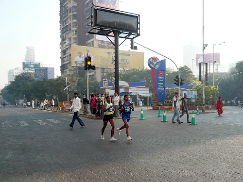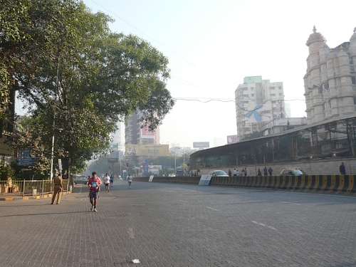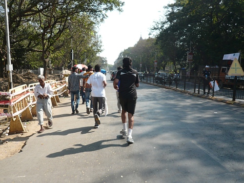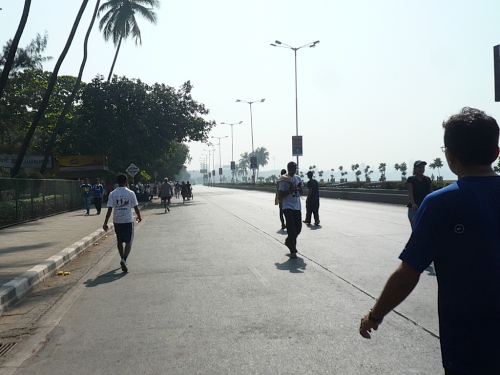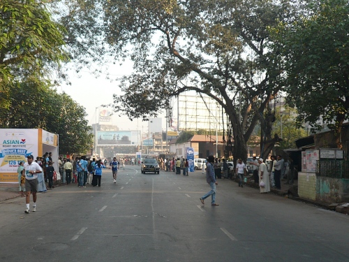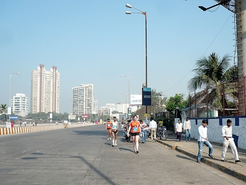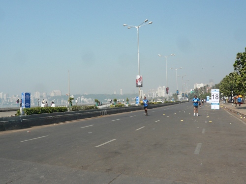 Nun geht es direkt in einem Bogen zum Marine Drive. Hier laufen wir bei km 3 eine kurze Wendepunktstrecke am Oberoi Hotel, das einer der Schauplätze der Terroranschläge vom 26.11.2008 war. Dann geht es weiter über einen U-turn und dann nordwärts über Das Halsband der Königin, dem Marine Drive. Auf dem nächsten Stück stehen alle 100m Lifebands. Die Stadt ist schon um 6 Uhr wach und erwartet die Weltenbummler, die rund um den Globus hierher gefunden haben um im Januar bei 30 Grad Marathon zu laufen.