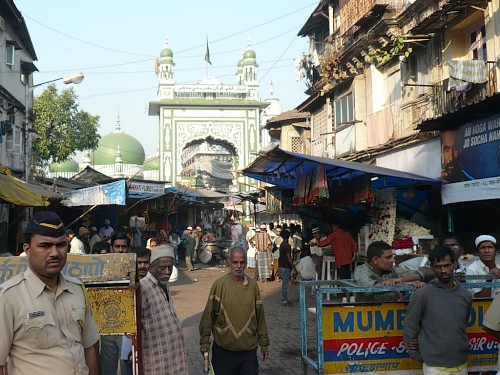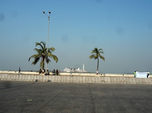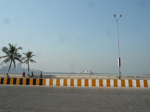 Es wird langsam hell. Links von uns auf dem Wasser liegt der Tempel Haji Ali Dargah. Der Morgen ist leider etwas diesig für klare Fotos. Auf einer kleinen Insel 500m vom Land entfernt liegt die Moschee und das Grab (Dargah). Die Insel, die nur bei Ebbe über einen knapp einen Kilometer langen Damm erreicht werden kann, liegt in der Worli Bucht. Das weiße Marmorgebäude mit dem 26m hohen Minarett erinnert an die Mogul-Architektur der damaligen Zeit und wird täglich von bis zu 15.000 gläubigen Muslimen und Nicht-Muslimen besucht.