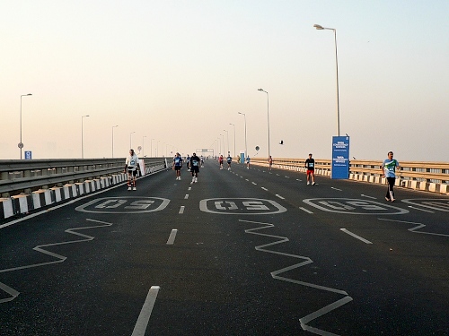 Wir verlassen die Brücke hinter km 20 und bleiben neben dem Wasser. Die Strecke führt uns parallel zur Bucht, die wir jedoch nicht sehen können. Es geht südwärts und wir erreichen den Halbmarathonpunkt, mitten in einem Slum gelegen. Die ganze Strecke ist mit 1.869 Polizisten für die Läufer abgesichert, aber es gibt keinerlei Belästigungen. Ganz im Gegenteil, es sind sehr viele Menschen an der Straße und klatschten uns zu.