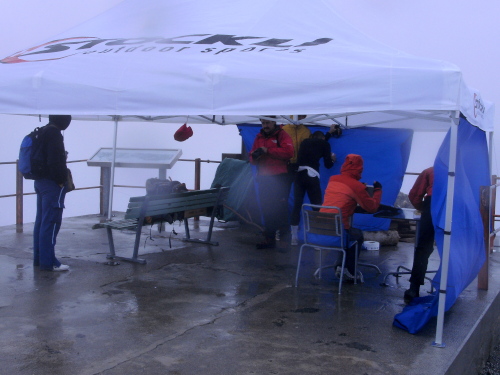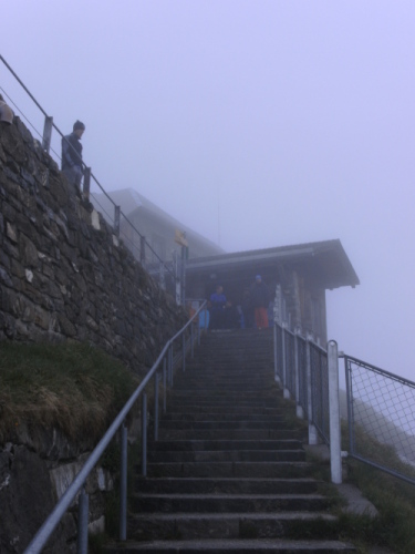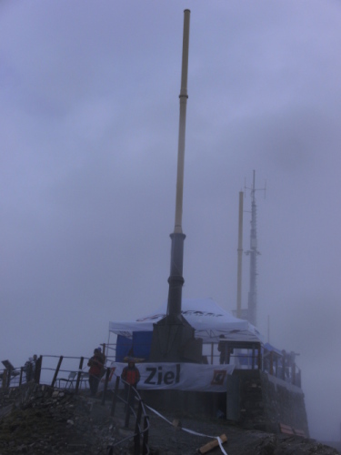 Auf dem kurzen Weg hinunter vom Gipfel zur Bergstation sehen wir nichts von der herrlichen Umgebung. Wir können gerade noch das Bergrestaurant erkennen, wo um 11 Uhr die Rangverkündung stattfinden wird.