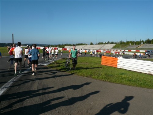 Kaum sind 5 km gelaufen, steht schon der erste am Rand und dehnt. Ob das noch gut gehen wird? Der eine oder andere ist schon schwer am Schnaufen, dabei ist dies bisher mit Sicherheit der leichteste Teil gewesen. „Flugplatz“, „Schwedenkreuz“, „Aremberg“, es gibt keinen Kampf mit der Ideallinie, nur die pure Freude an der wunderschönen Eifellandschaft und dem Gefühl, über nicht gerade alltäglichen Asphalt zu laufen. Ich empfinde das als wirklich erhebend, dieses Gefühl sollte sich jeder wenigstens einmal gegönnt haben, auch wenn es „nur“ 22,4 km und damit ein „Unterdistanzlauf“ ist. Gerade beim ersten Mal. Macht doch, wie ich, einen Trainingslauf daraus, ich möchte das Erlebnis nicht missen.