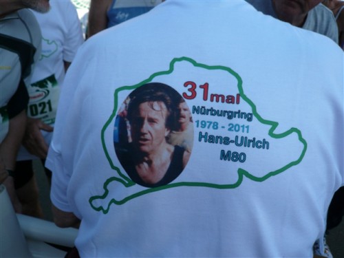 Insgesamt sind es heute noch 15, die alle Läufe mitgemacht haben, auf dem Foto habe ich sie verewigen können. Und drei von ihnen werden sich zum 31. Mal sogar an die Königsstrecke heranwagen, nämlich Heinz Sindorf (M 70), Wolfgang Rausch (M 60) und Franz-Josef Zander (M 60). Hans-Ulrich Lang, der „Chef“ der Nürburgringlauf-Veteranen, hat wieder ein T-Shirt anfertigen lassen. Hans-Ulrich ist 82 Jahre alt und kommt von der Schwäbischen Alb! Das toppt sogar noch das 85jährige Klärchen, die am letzten Sonntag als älteste Teilnehmerin die 8 km des Women’s Run in Köln in flottem Tempo hinter sich gebracht hat. Beeindruckende Bilder, sowohl als auch!