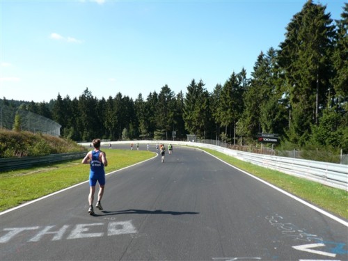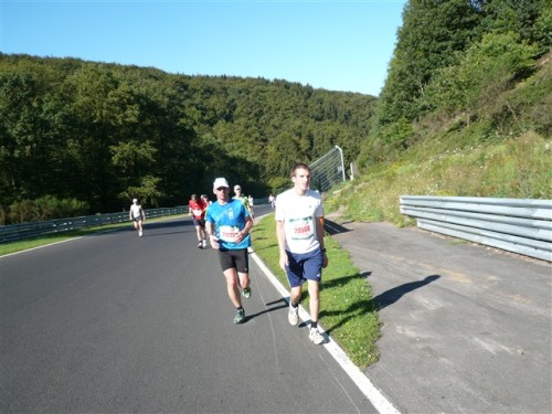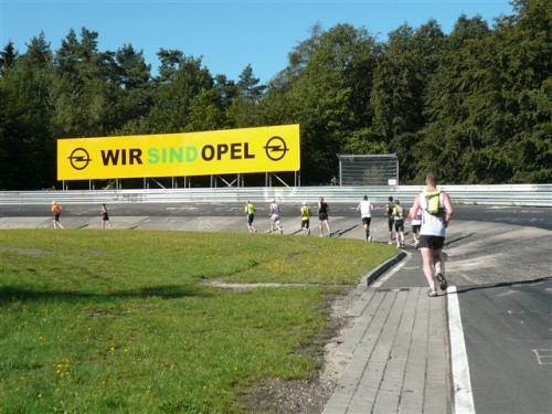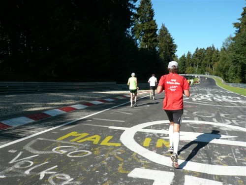Langsam hebt sich das Streckenprofil durchs „Kesselchen“. Wer mit zu viel Gas durchmarschiert, wird zwar die scharfe Rechtskurve im „Klostertal“ noch packen, aber spätestens nach der legendären 180-Grad-Kehre „Caracciola-Karussell“, für mich mit der Steilkurve ein besonderes Glanzlicht, zeigt sich, wer seine Kräfte richtig eingeteilt hat. Mit einer Steigung bis zu 17 Prozent reckt sich die Nordschleife hoch zum Streckenabschnitt „Hohe Acht“. Ich bin dank eigener Erfahrung vorgewarnt und es gelingt mir, zunehmend andere Läufer einzusammeln. Kraft in den Beinen ist ausreichend vorhanden und ich kann daher ordentlich drücken.