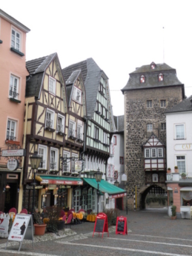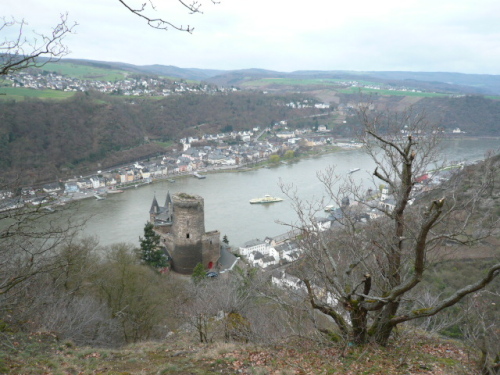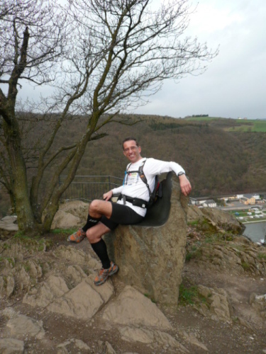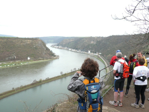 Nach verschiedenen Aufs und Abs erklimmen wir den sog. Lennig und haben einen sagenhaften Blick auf das Taubenwerth (Rheininsel) und dahinter Oberwesel mit seiner roten Kirche, welche die älteste bildliche Darstellung von Koblenz birgt, einen ganz besonderen Schatz. Ach Du lieber Himmel, in zwei Monaten schon werde ich wieder dort unten stehen, um mit dem Mittelrhein-Marathon die letzte lange Trainingseinheit für Biel zu absolvieren.