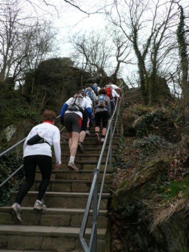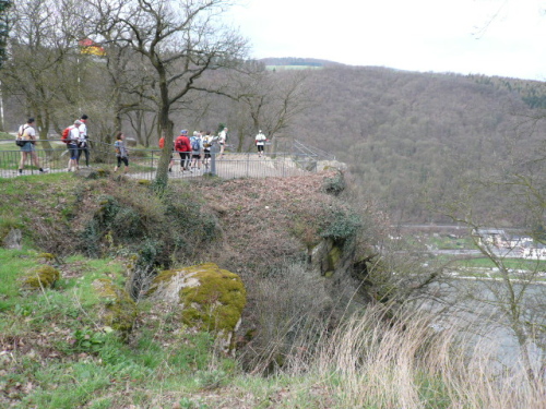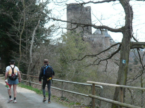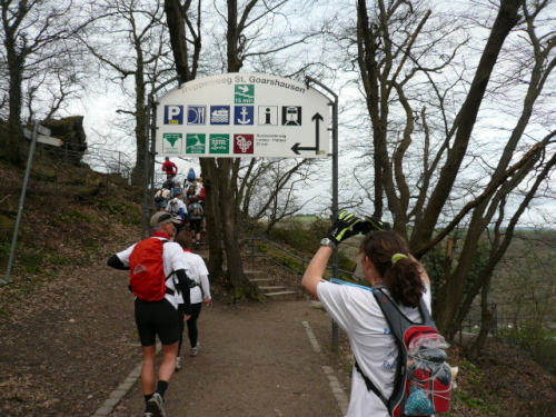Leider müssen wir uns bald lösen, denn vor uns liegen noch weitere Täler und Plateaus. In das Urbachtal (hat nichts mit der Ultralauflegende Helmut Urbach zu tun!) klettert der Steig durch verwilderte Weinberge über Fels und Treppen zum Bach, um letztlich die „Alte Burg“ anzusteuern. Hier liegen ausnahmsweise mal nur Steinreste, denn die 1359 erbaute Burg wurde schon kurze Zeit später wieder zerstört. Durch Niederwald und Büsche ersteigen wir die Felsen am Roßstein. Sehr schön sehen wir die Schönburg über Oberwesel.
