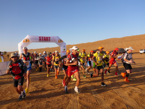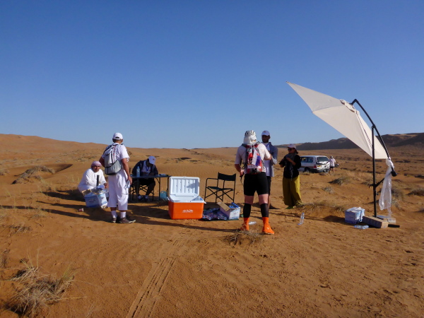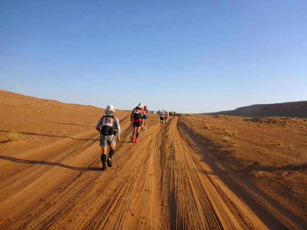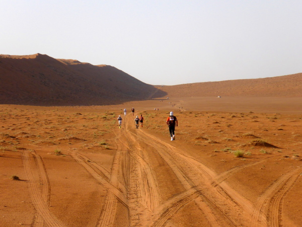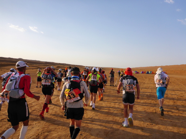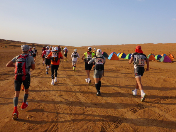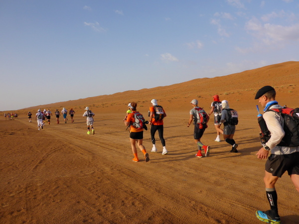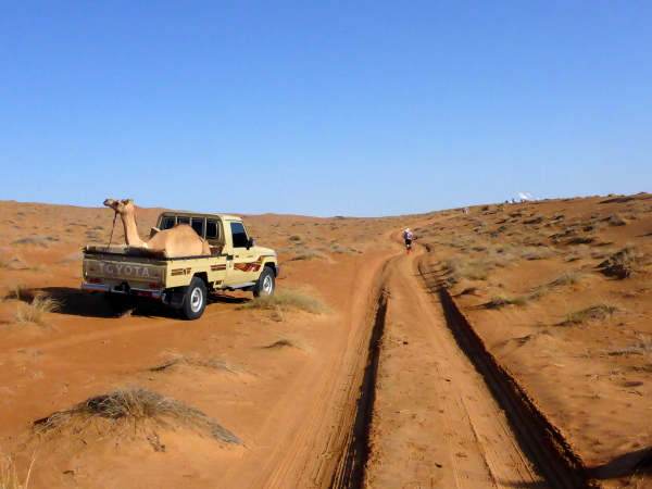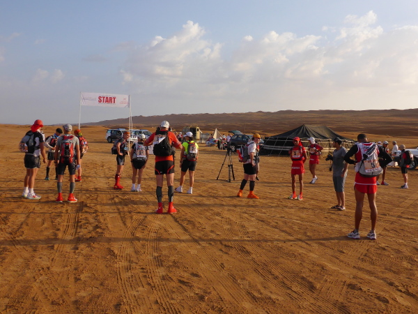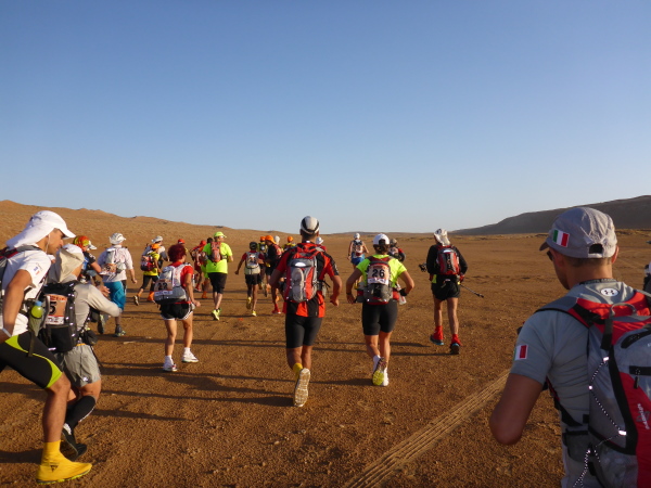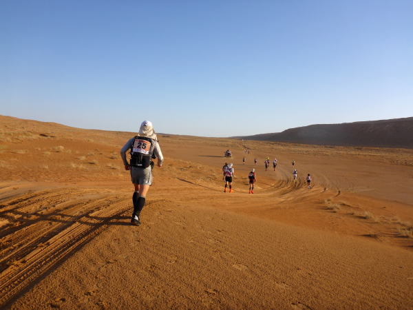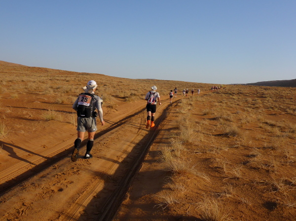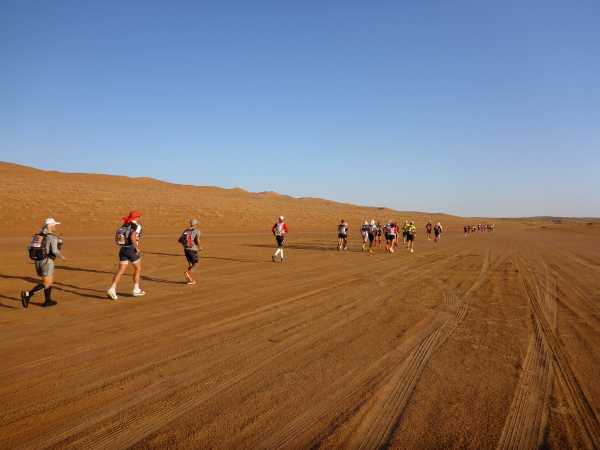 Die ersten drei Etappen sind zur Eingewöhnung, im Sand ist Tempolauf anstrengend. Wunderschön, traumhaft, bewegend, technisch nicht riskant. Drei Ärzteteams, unzählige Begleitfahrzeuge, ein Krankenwagen und zwei Polizeifahrzeuge überwachen die Laufstrecke. Es geht nach Süden, zunächst durch ein Tal. Doch bald geht es hinauf in den Sand.