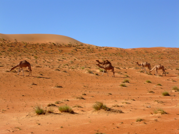 Zunächst geht es schnell durchs Tal. Der Sand ist vom Tau noch fest. Erst gegen 8 Uhr wird er von der Sonne aufgeweicht, dann sind wir auch schon in den Dünen. Ein Pick-Up überholt mit festgebundenem Dromedar hinten drauf. Krotesk, aber das gefesselte Tier genießt es. Pick Ups sind für Ausländer verboten, dies sei nicht standesgemäß sagt man mir.