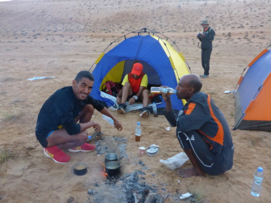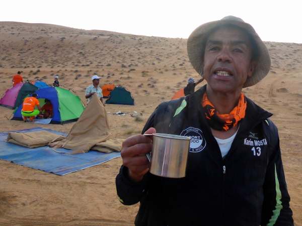Junge, war das wieder eine Scheiß Nacht! Der Morgentau mit dem kriechenden Wind setzt der Gesundheit zu. Jeder rotzt morgentlichen Schleim in den Sand. Längst habe ich gelern,t meine Ausrüstung vor dem Tau zu schützen, aber heute hängt noch mein Hemd in einer Zeltschlaufe. Igitt! Jeder sortiert seine Ausrüstung hochkonzentriert vor dem Start.