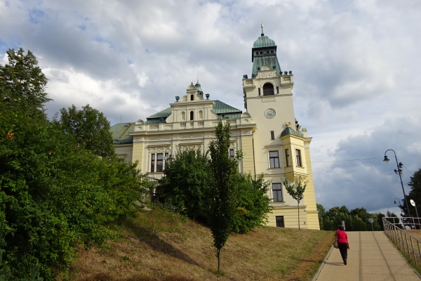Ich spaziere nun mehrere Kilometer vom Westen in den Nordosten der Stadt zurück. Die Ostravice ist eigentlich ein kleiner Fluss mit wenig Tiefe und geringer Breite, dennoch scheinen einige auf Kajaks Wildwasserfeeling zu bekommen. Eine von vielen Brücken führt auf die andere Seite hinüber, wo sich in Hanglage das alte Rathaus befindet, in dem die Slesko-Ostravsky Galerie untergebracht ist. Gegenüber der Keltickova-Straße steht auf einem Sockel ein Panzer, der an die Befreiung des in der Hand der Deutschen Wehrmacht befindlichen Ostrava durch die Rote Armee im Mai 1945 erinnern soll.