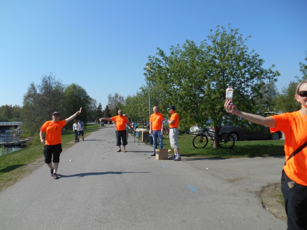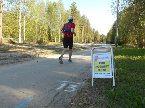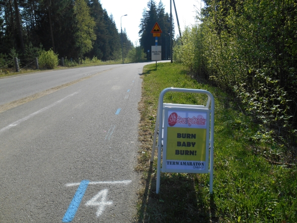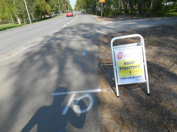 Ab KM 26 müssen wir gehen, wobei er immer wieder darum bittet, sich hinlegen zu dürfen. Ich habe Angst, dass wenn er erst einmal im warmen Gras liegt, er nicht mehr aufstehen kann, also rede ich weiter auf ihn ein und verspreche ihm eine Pause beim nächsten Verpflegungspunkt. Dieser kommt erst bei KM 31 und als wir den erreichen, lässt sich er sofort ins Gras fallen. Die Sanitäter kommen schon herbeigelaufen, aber als sie uns erreichen, beteuert Christian, dass es ihm gut geht und er weiterlaufen könne. Wir nehmen uns Wasser und gehen ein Stück weiter, wo er sich wieder ins Gras setzt. Nun holen uns der Garmin-5h-Hase und seine Entourage ein. Sie rufen uns noch etwas in Finnisch zu und schon sind auch sie an uns vorbeigezogen. Eigentlich lassen allein die langsamen Läufer die schnelleren Läufer erst so richtig gut aussehen. Gern geschehen.