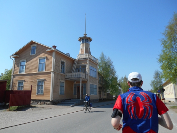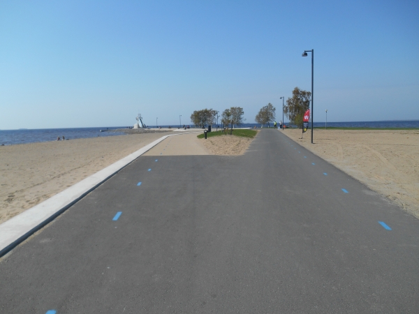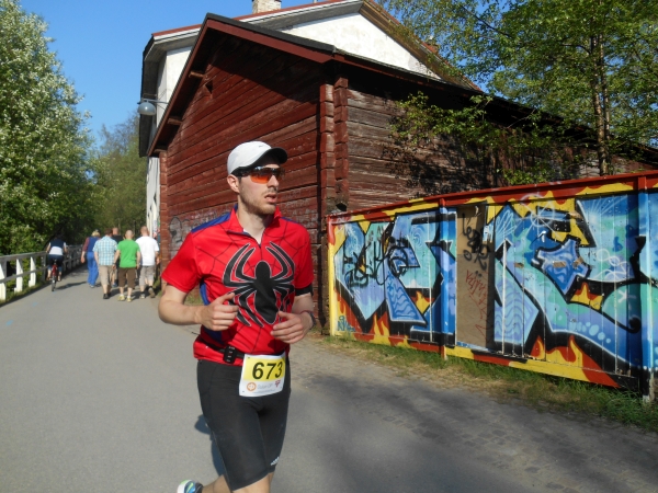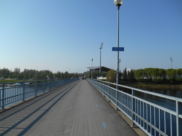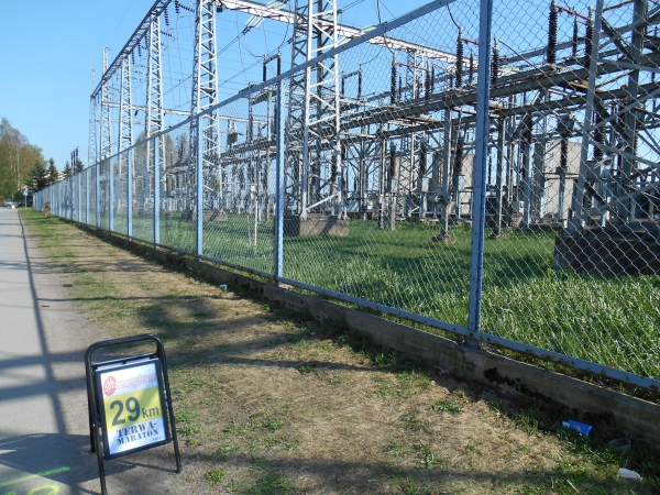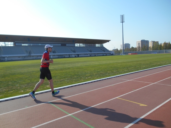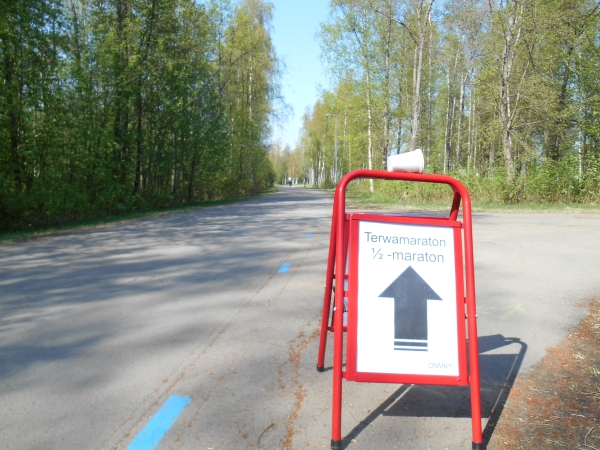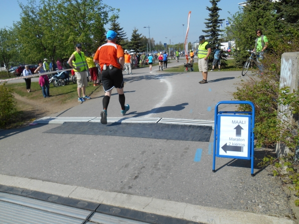 Keine Halbzeiten. Kein Auswechseln. Keine Time-Outs. Laufen ist ein Sport und kein Spiel. Die Gäste sind deshalb auch nicht zum Spielen hier, sondern zum Laufen. Kurz vor KM 20 laufen wir geradewegs auf das Ziel im Raatin Stadion zu, um dann allerdings auf unsere zweite Runde abzubiegen. Die Halbmarathonläufer laufen hier direkt nach der Brücke in das Stadion ein und haben nach 400m das Zieltor erreicht. Waren wir bis hier in bunter Gesellschaft und umringt von Läufern, sind wir nun völlig allein. An der Verpflegungsstelle Raatin sari bei KM 20,7 direkt nach der Abbiegung ist man ganz erstaunt darüber, dass doch noch zwei Läufer auf die zweite Runde gehen und man überhäuft uns mit Rosinen und Squeezy Gels. Die Gruppe um den 5h-Hasen ist nach wie vor hinter uns, ihnen wird man wohl die übrigen Bananen hinterher werfen. Beide Runden (und damit auch die Verpflegungspunkte) sind identisch mit einer Ausnahme. Am Strand von Nallikari müssen wir nun eine extra Schleife und ein paar hundert Meter in Richtung eines Leuchtturms laufen, bei einer Pylone wenden und wieder zurücklaufen. Dann kommt bei KM 24,3 auch schon wieder ein Verpflegungspunkt.