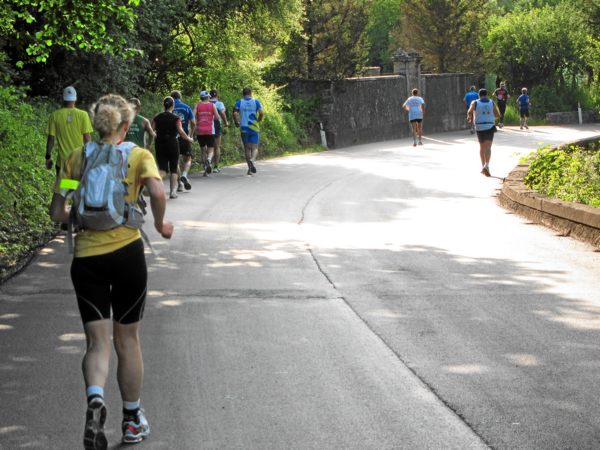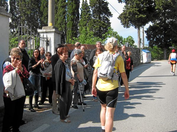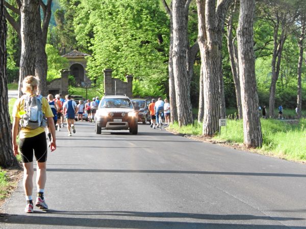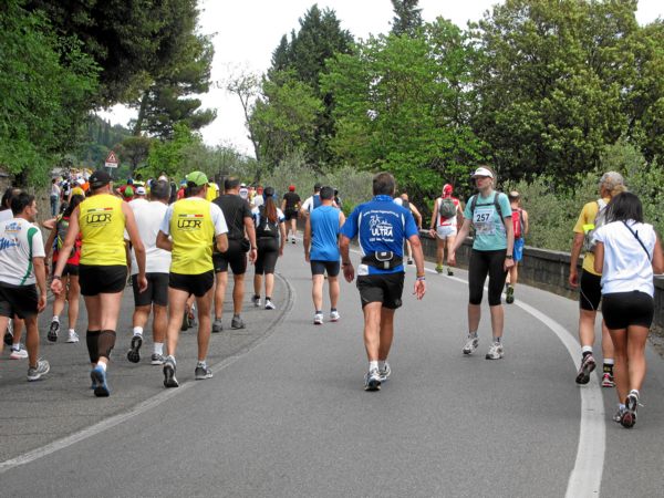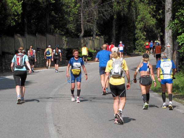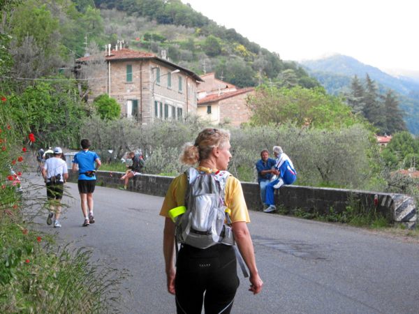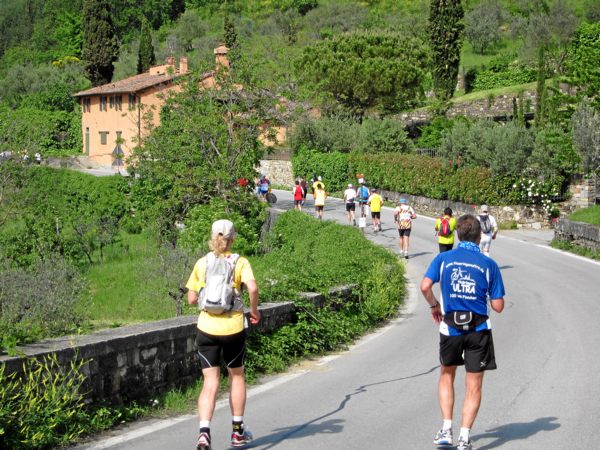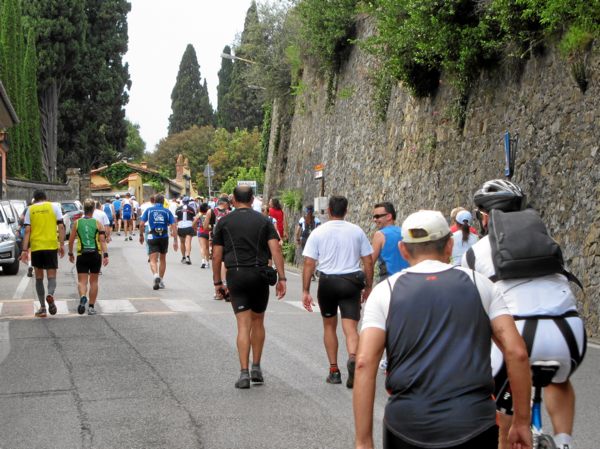 Es ging weiter steil aufwärts, hinaus aus dem letzten Ortsteil von Florenz und hinein in die Landschaft. Es wurde weniger steil und immer wieder gab es auch kurze, ebene Abschnitte. Immer noch liefen wir mitten im Feld, um uns herum nur Italiener, alle gut drauf, die Landschaft war nicht mehr so spektakulär, aber die Häuser und Gärten an der Straße stets eine Augenweide. Vor manchen standen die Bewohner und feuerten uns an. Ja, so konnte es weiter gehen und so ging es auch weiter.