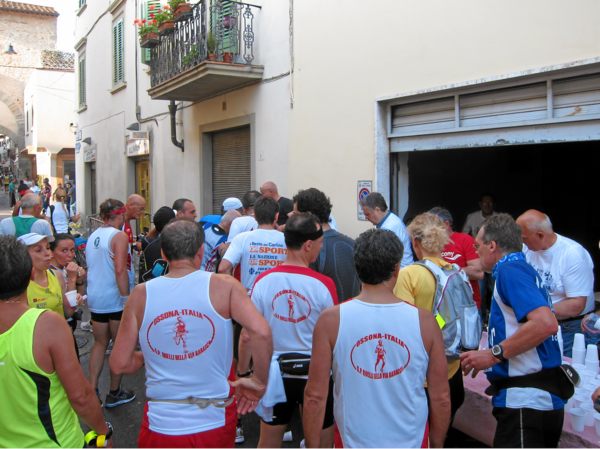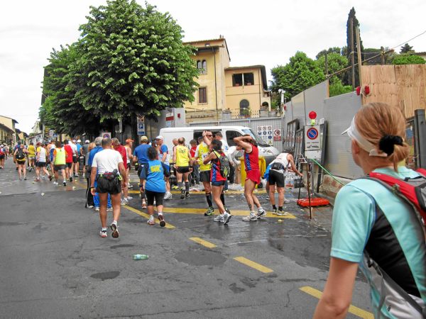 Etwa alle vier Kilometer gab es bisher eine Verpflegungsstelle. Seit Fiesole hatten sie sich deutlich gebessert, nicht was das Angebot betraf, das war schon von Anfang an reichlich, sondern der Zugang. Es drängelten nicht mehr so viele um den Tisch, man kam beinahe ungestreift an die Getränke und das Essen und ich hatte die letzten drei oder vier Mal jeweils ordentlich zugelangt. Die Temperaturen waren auch nicht so, dass man hätte übermäßig schwitzen müssen, immer noch etwa 25 Grad, meist aber leicht bewölkt, so dass die Sonne nicht einheizen konnte.