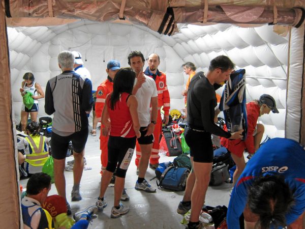 Vor dem Start konnte man einen Kleiderbeutel abgeben, der dann hierher gefahren wurde. Tatsächlich bekam ich ihn auch recht flott. Mein durchnässtes Shirt wechselte ich aber nicht, sondern zog ein trockenes drüber, das musste reichen. Kälter als hier oben konnte es ja nicht werden, denn ab jetzt ging es abwärts. Wir liefen durch eine laue Frühsommernacht in der Toscana. So weit meine Überlegungen. Die Handschuhe ließ ich daher im Beutel, meine dünne Jacke, die ich bis hierher im Trinkgürtel mitgetragen hatte, verstaute ich im Beutel, lediglich die Stirnlampe holte ich heraus.