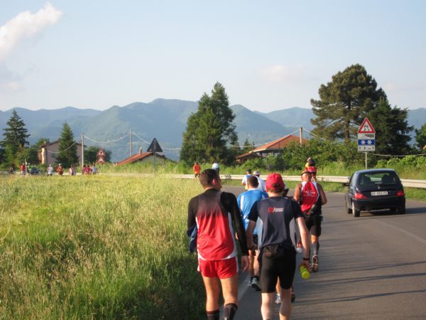 Die deutlich schwerere erste Hälfte war geschafft, noch 52km bis ins Ziel nach Faenza und das Höhendiagramm zeigte nur noch abwärts, keine einzige Steigung mehr. In der Tat ging es jetzt ganz anständig abwärts, nicht steil, sondern so, dass man sozusagen mühelos laufen konnte und das taten wir dann auch. Angelika beklagte sich zwar über eine Blase, aber so schlimm konnte das nicht sein - aber mir taten meine Füße weh. Vor allem mein Gelenk am großen Zeh schmerzte, die Operation vergangenen November hat da nicht viel geholfen. Trotz aller Beschwerden aber machten wir Tempo.