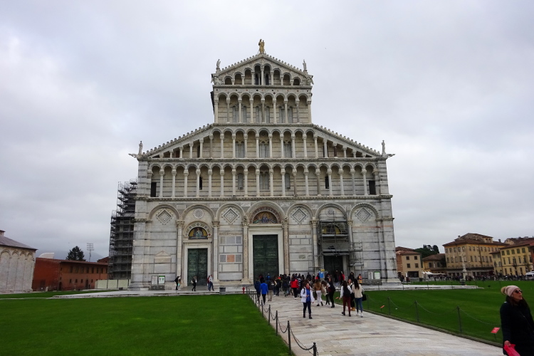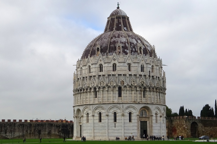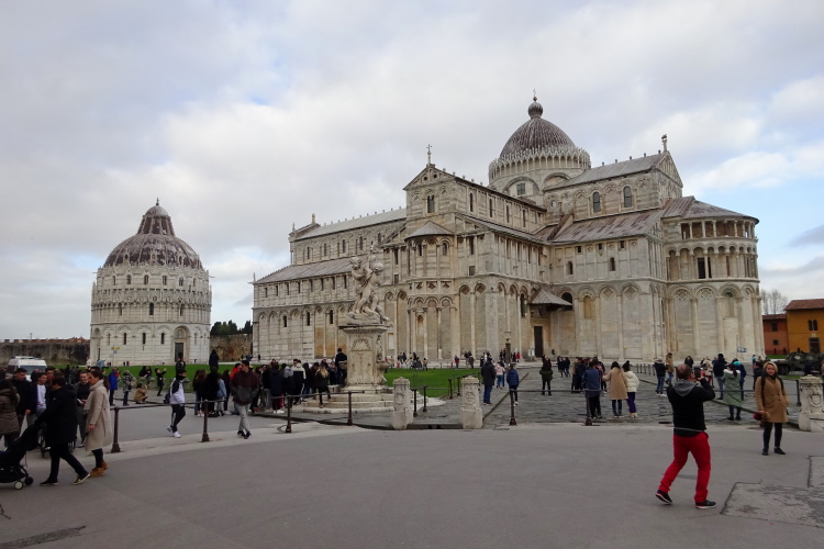 Die beiden anderen Bauwerke sind aber nicht minder bedeutend: der aus Carrara-Marmor errichtete Dom Santa Maria Assunta von Pisa galt jahrhundertelang als monumentalster Bau der christlichen Geschichte und ist neben dem in Florenz die zweitwichtigste Kirche in der Toskana. Das 54 m hohe Baptisterium des Doms von Pisa aus dem 12. Jahrhundert ist ebenfalls ein imposantes Gebäude neben der Kathedrale.