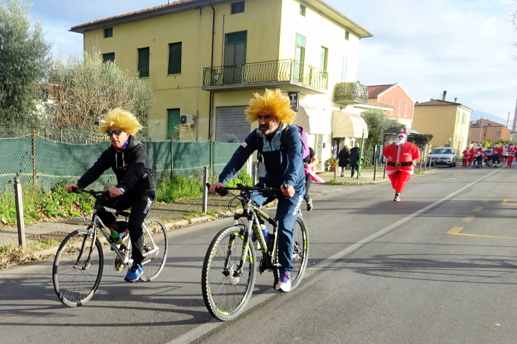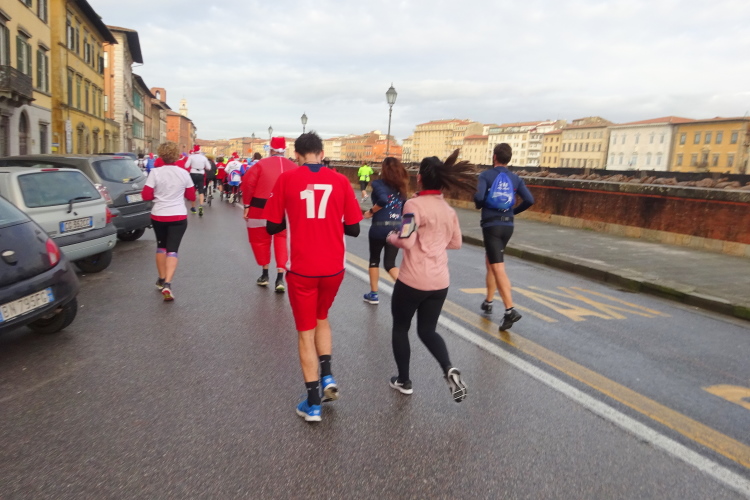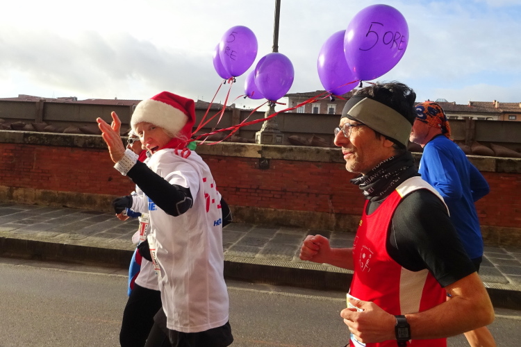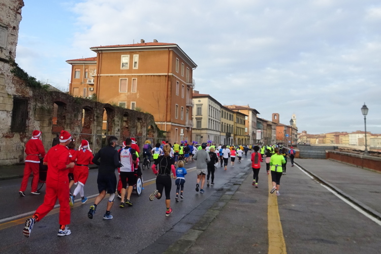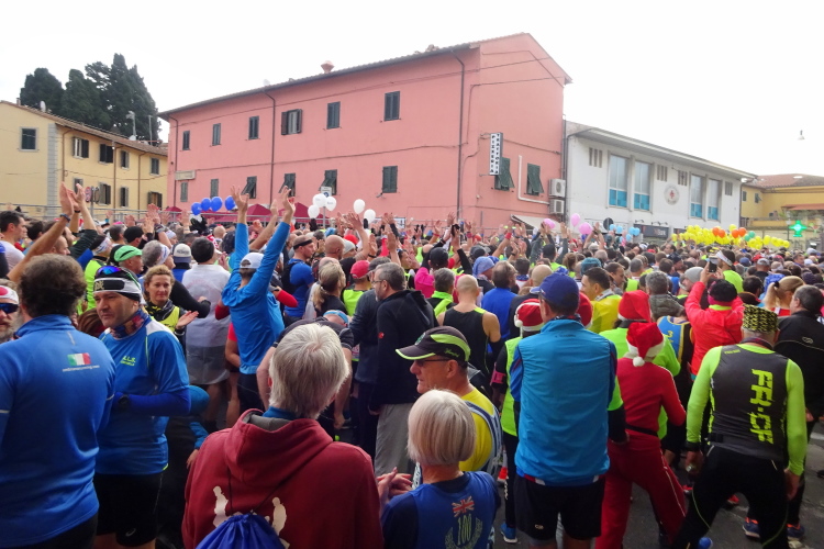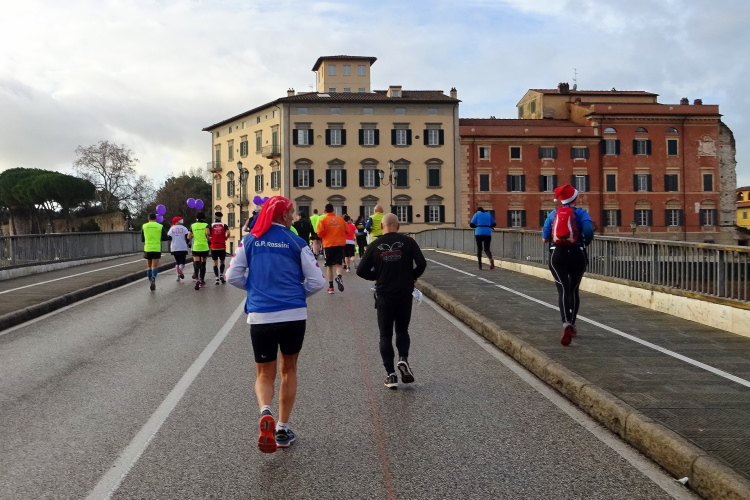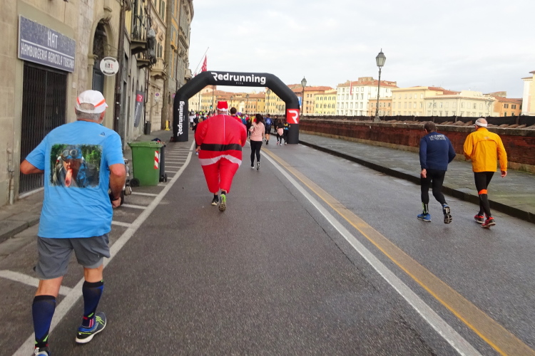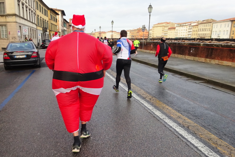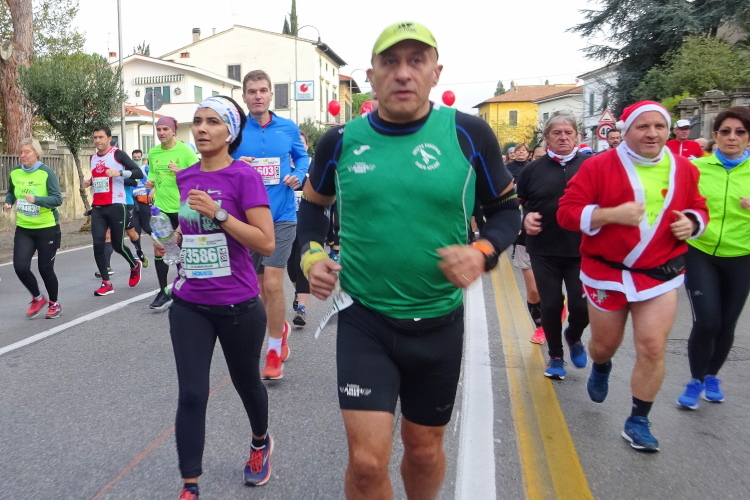Bei der Porta Nuova stehen die Pacemaker gestaffelt von 3 bis 5 Stunden, an ihren bunten Ballons gut erkennbar. Im eigentlichen Startbereich an der Piazza Daniele Manin herrscht dichtes Gedränge, die Ordner sind überfordert, jeder stellt sich rein, wie es ihm passt. Startblöcke gibt es keine, zumindest nicht ersichtliche. Dann geht es los. Wir laufen nach Süden in Richtung des Arno. Ein Läufer dreht sich um und sagt, dass er sich auf den Bericht freue. Es ist Volker Vogt aus Cotbus, den ich in den vergangenen Jahren schon mehrmals bei Marathons getroffen habe. Der Kurs dreht nahe dem Arno nach Osten, wir laufen flussaufwärts an der Ponte della Citadella und der Ponte di Mezzo vorbei. Nach wenigen Kilometern hat mich die 5 h-Pacer-Gruppe überholt. Es geht nun über die Ponte della Fortezza auf die andere Flussseite, umringt von einer Abordnung von Weihnachtsmännern, die einige Kameraden mit Handicap im Rollstuhl schieben. Die Strecke führt vorbei an der Dornenkirche, die ich ja gestern fotografiert habe.