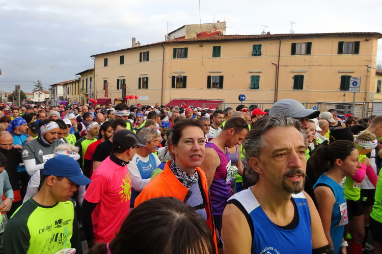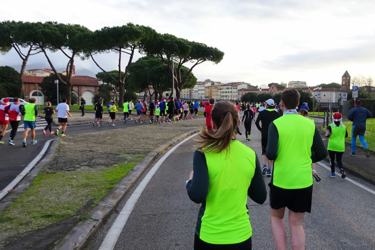 Die Marathonstrecke führt nach dem Kilometerpunkt 29 vom Meer weg, es geht nach Osten entlang des Lungarno Gabriele D'Annunzio wieder zum Ausgangspunkt zurück. Den Fluss Arno sieht man zu unserer Linken nur an gewissen Stellen, zahlreiche, den Winter über eingelagerte Segelboote in nur zum Teil eingezäunten Arealen stellen Millionenwerte dar. Die Straße ist zu diesem Zeitpunkt in entgegenkommender Richtung stadtauswärts wieder für den Verkehr freigegeben. Nach der Versorgungsstelle bei Kilometer 35 mache ich erneut etwas Boden gut, aber die erhoffte 5:30 Stunden-Finisherzeit wird sich kaum mehr ausgehen. Bei Kilometer 30 kommt die Ortstafel von Pisa in Sicht, 3 km sind zwar nicht mehr weit, aber ich brauche fast noch eine halbe Stunde bis ins Ziel.