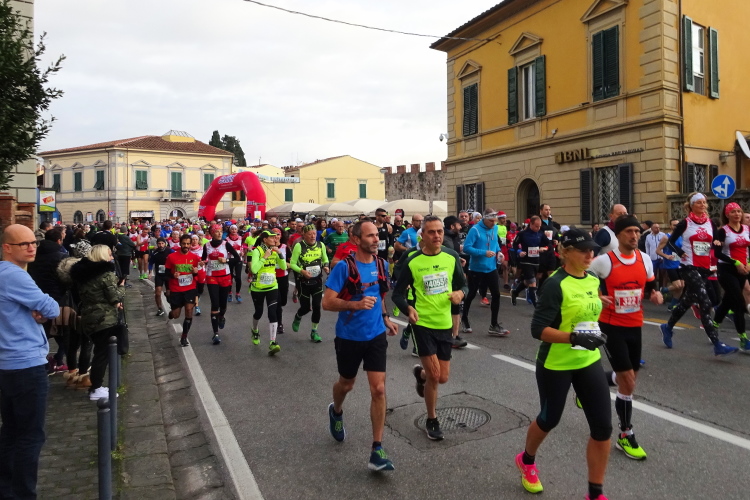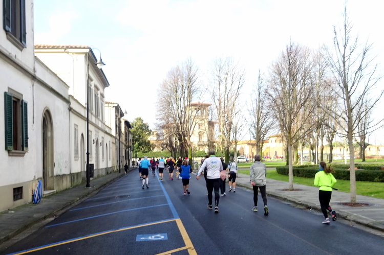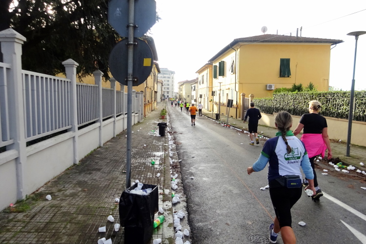 Der Marathonkurs verläuft durch das Stadtviertel San Antonio an der im romanischen Stil erbauten Chiesa San Paolo a Ripa d'Arno vorbei. In meinem läuferischen Umfeld ist auch Francesco, der den gesamten Marathon im Eiltempo walken will. Die Labe nach 5 km ist gut bestückt, mein Wunschgetränk ist warmer Tee, den es mit Keksen, Obststücken, Iso und Wasser ausreichend gibt. Die erste Versorgungsstation werden wir gegen Ende des Marathons am Wege in die Stadt zurück nochmals frequentieren.