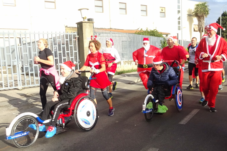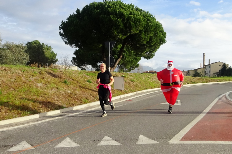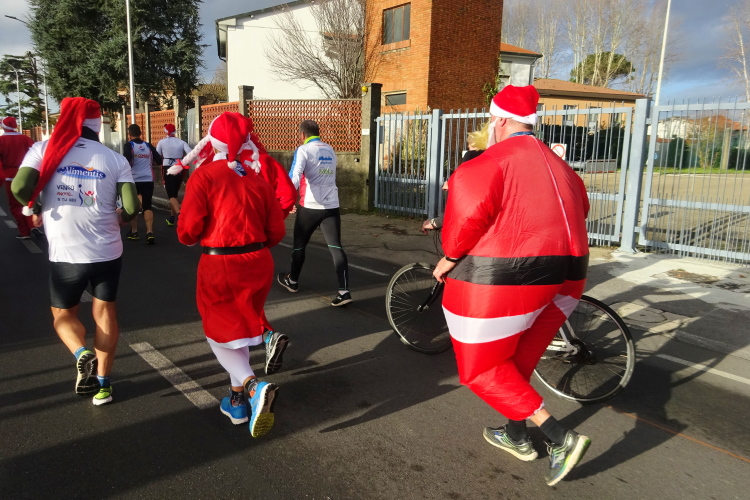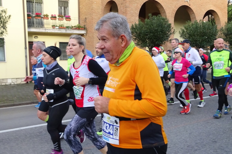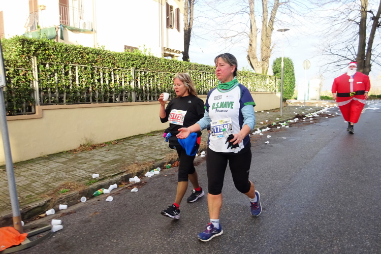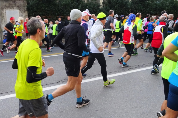 Der Marathonkurs führt aus der Stadt hinaus, ich versuche den Ansturm der Weihnachtsmännerabordnung zu entfliehen. Der Spuk ist bei der letzten Abbiegung für die Kurzdistanz 14 km vorbei. Sie drehen ab und kehren zum Ausgangspunkt zurück, während Francesco versucht, Vito Piero und mir davonzueilen. Man stelle sich vor, er walkt den Kilometer unter 8 Minuten. Da er bei den Laben nie stehenbleibt, müssen wir ihm immer wieder nacheilen. Das kostet Kraft und mein linkes Knie macht sich wieder bemerkbar.