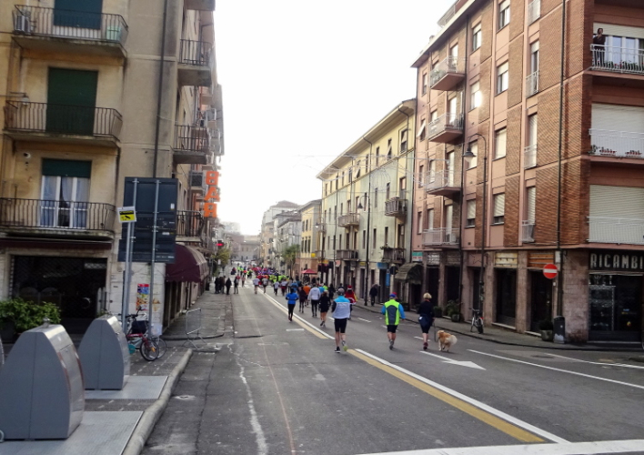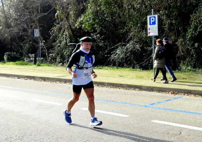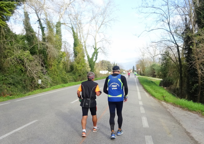 Seit dem Start vor mittlerweile 38 Minuten sind meine zwei Kontrahenten, die Italiener Vito Piero (auch Mitglied im Club Super Marathon Italia und mit mehr als 1300 Marathons einer der ganz großen Sammler), Dauerwalker Francesco und eine Läuferin mit Hund zurückgefallen.