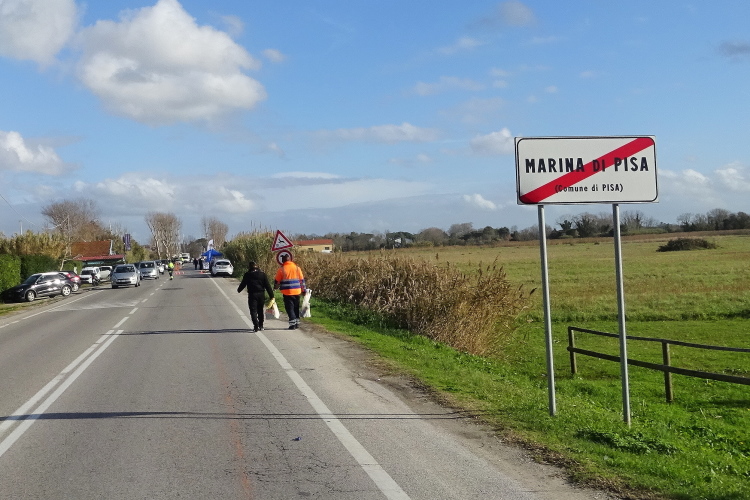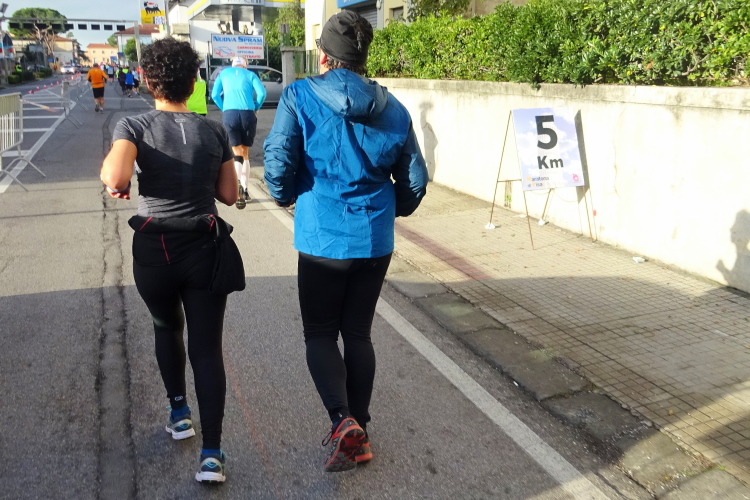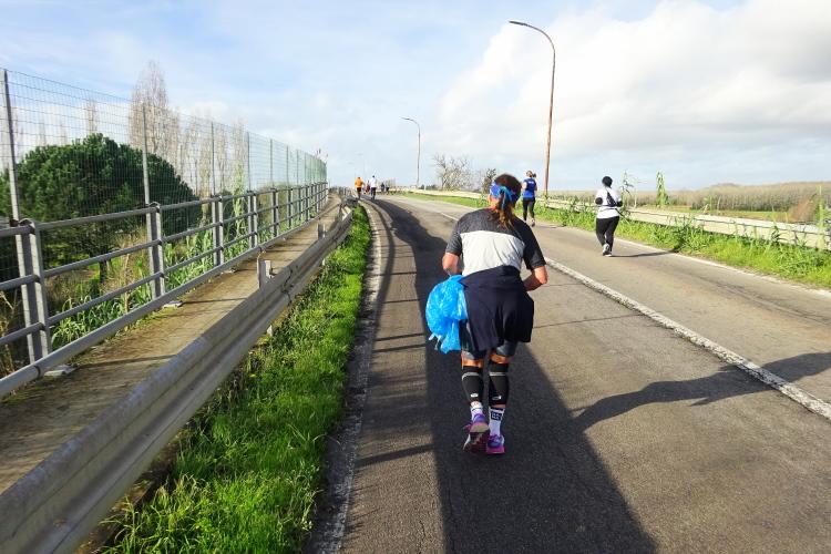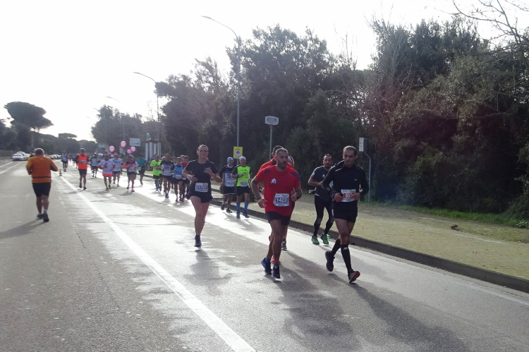Nun geht es leicht ansteigend durch ein größeres Pinienwaldgebiet. Zwei Radfahrer brausen uns entgegen. Im Sommer mag es hier sehr angenehm kühl sein, heute merkt man den Temperaturunterschied zur offenen Landstraße. Mein Vorsprung schmilzt, die kleine Gruppe mit Francesco, Vito Piero und Elisabetta nähert sich unaufhaltsam. Sie schnappen mich, obwohl ich ein paar schnellere Laufeinheiten einlege. Das Mar Tirreno riecht man schon, vorbei an einer Miltärbase kommen wir zur Küstenstraße. Während wir Nachzügler nach Süden laufen, kommen uns auf der 3 km langen Begegnungsstrecke zur unserer Rechten alle entgegen, die inzwischen voranliegen.