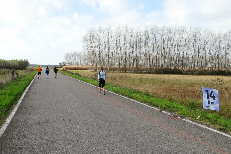 Es dauert, bis ich wieder an meine Kontrahenten aufschließen kann. Erst bei der Abzweigung der Halbmarathonläufer nach ca. 12.5 km gelingt dies. Diese machen sich auf den Rückweg, für uns geht es nach Südwesten zum Meer weiter. Die noch ziemlich grünen, von Kanälen und Tümpeln durchzogene Landschaft zum Winterbeginn hier in der Toskana zeigt wieder einmal auf, wie klimatisch begünstigt die Menschen hier leben. Und wie schön man es als Marathontourist hat, wenn man in der Welt herumkommt.