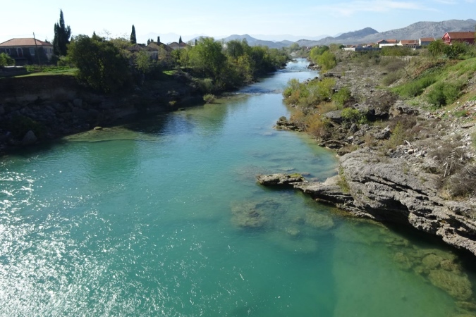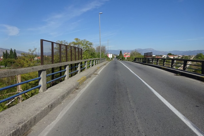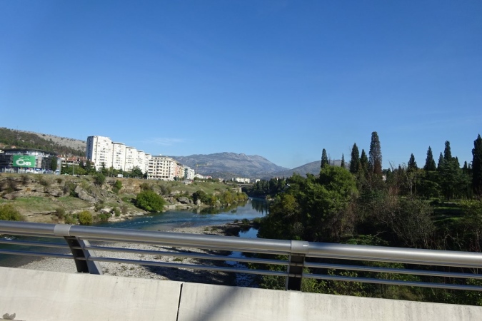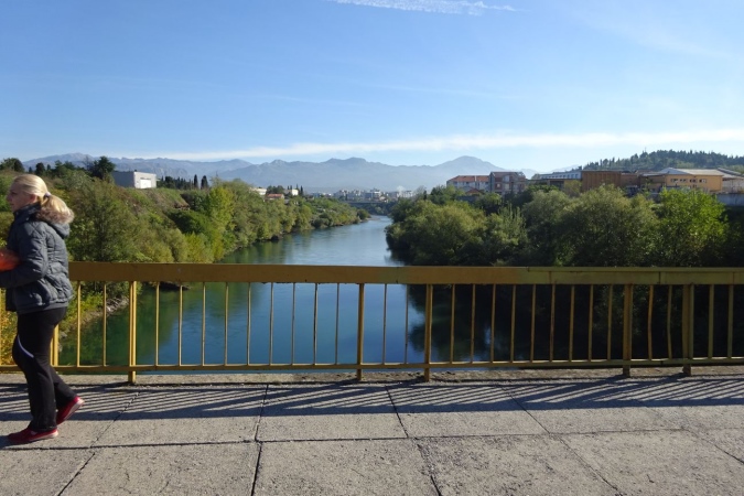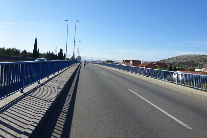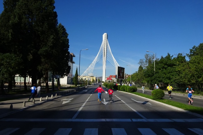 Eine weitere Brücke, die Krivi most, führt über die Morača, bald haben wir 5 km geschafft. Nun biegen auch die 10 km-Läufer nach links ab, wie ca. zwei Kilometer davor die zumeist jugendlichen Teilnehmer am 5 km-Run. Zum Spaß bewege ich mich in die falsche Richtung, worauf der Streckenposten, ein sympathischer junger Helfer, gestikulierend mit beiden Händen in die andere Richtung deutet. Als er den Spaß erkennt, lacht er wie ich laut auf.