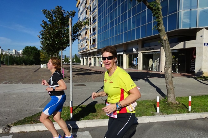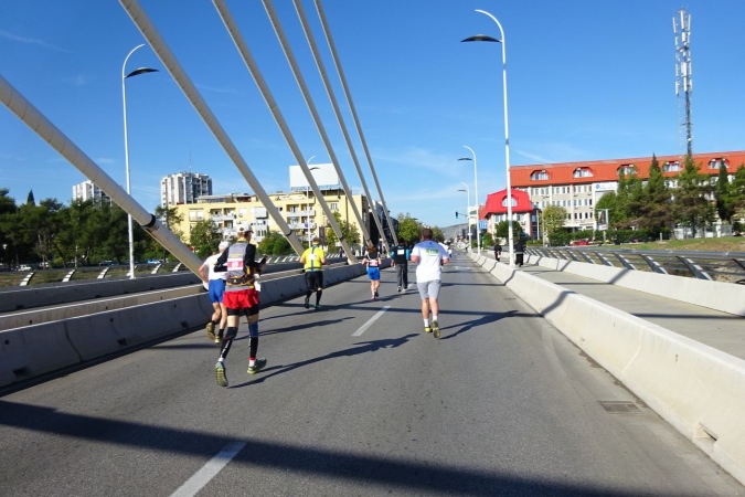 Der Kurs beginnt auf der ul. Slobode direkt beim Platz der Republik. Ich schließe zu Doris Sagasser auf und laufe nun Seite an Seite mit ihr über die Millenniumsbrücke. Die den Ablauf störenden Kinder sind nach nur einem Kilometer schon müde und traben des Weges. Offenbar galt der Start knapp nach 9 Uhr auch den 5 und 10 km-Läufern, denn unter uns sind welche mit gelb und grün unterlegten Nummern.