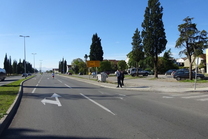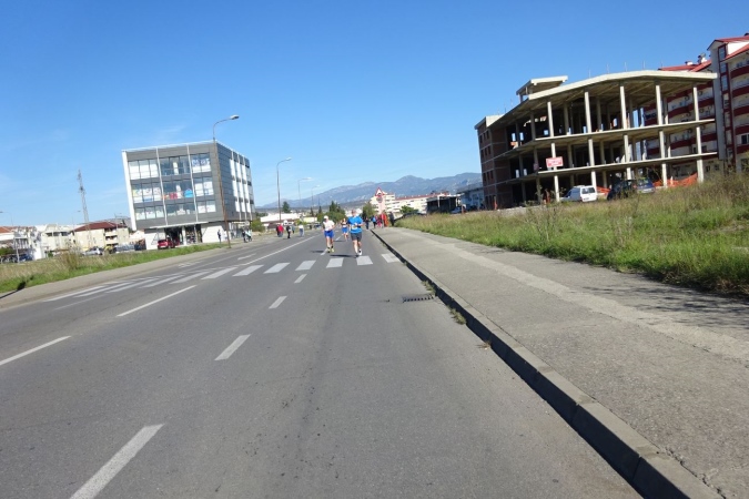 Es geht in westliche Richtung weiter, wir haben das Zentrum von Podgorica nach 2 Kilometern schon hinter uns gelassen. Die Straßen sind für den Verkehr gesperrt, die Autofahrer halten sich daran. Doris und ich laufen etwas über einen 6er-Schnitt, also mit ca. 10 km/h oder 6 Minuten für einen Kilometer. Mein Ziel ist eine Halbmarathonzeit unter 2:10, 4:45 peile ich insgesamt an.