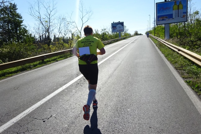 Ich blicke mich um, es kommen nur wenige Läufer nach. Da sagt Doris, dass wohl noch etliche hinter uns sind, so auch Peter und Yen vom Country Club. Ein Läufer mit der Nummer 84 schließt zu uns auf. Seine ganze Hochachtung gilt Doris vom 100 MC DEU, die inzwischen 303 Marathons gefinisht hat. Der Kollege aus Serbien erwähnt, dass er zwar schon 20 Halbe habe, aber er heute seinen ersten ganzen laufen will. Ich bezweifle, dass er das erhöhte Tempo ganz durchalten und bald zurückfallen wird – aber auch wir müssen erst einmal finishen.