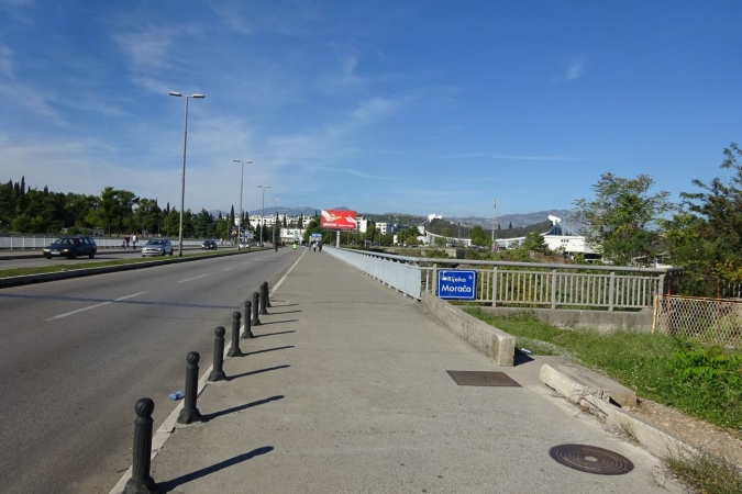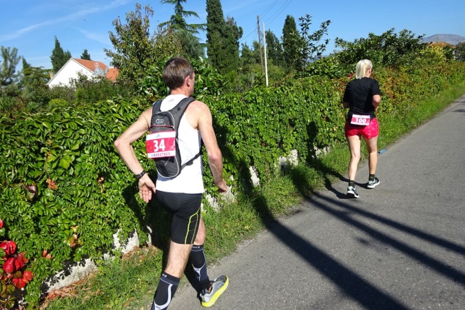 Bei Kilometer 32 gibt es dann wieder Wasser in Bechern und ich habe Gelegenheit, den Kopf zu kühlen. Nach der Brücke über die Cijevna, die im Laufe ihrer geologischen Geschichte tiefe Einschnitte in die Felsen gegraben hat, bekommt die Marathonstrecke mehr Gefälle. Ich blicke mich um, doch die Fernsicht ist wegen des Kurvenradius geringer geworden. Doris ist einstweilen nicht mehr zu sehen. Sobald aber der Anstieg geschafft ist, sehe ich mehrere Läufer als Silhouetten näherkommen.