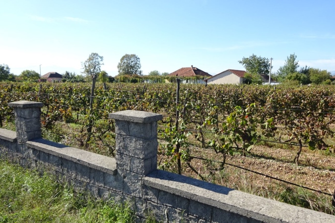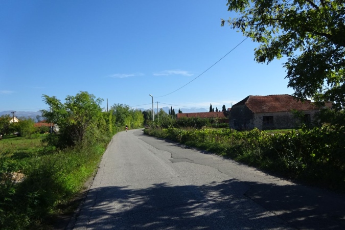 Ich blicke mich um, Doris ist zurückgefallen, doch der Belgier mobilisiert nun seine Reserven und geht bei Kilometer 22 an mir vorbei, kommentarlos. Mir gefällt die ländliche Gegend hier um Mataguzi, die primär auf die Landwirtschaft ausgerichtet ist. Man sieht im Vorbeilaufen alte und neue Bauernhäuser, die zum Verkauf stehen („prodaje se kuca“) Weingärten, Zypressen wie in Apulien, frisch gepflügtes Ackerland. Und die eine oder andere Kuh auf der schon karg gewordenen Weide. Bei strahlend blauen Himmel und schon spürbaren 20 Grad könnte es schöner nicht sein.