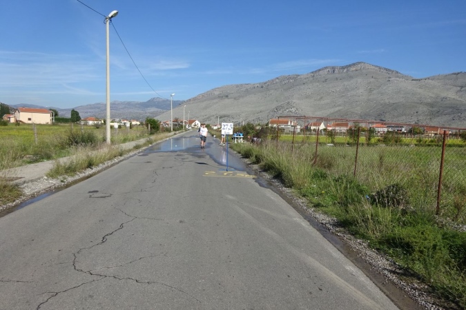 Bald sind auch 15 km geschafft, bei Golubovci verlassen wir die E80 und bewegen uns nun in östliche Richtung auf Zubringerstraßen in ländlicher Umgebung. Endlich kommen wir mit der Nummer 34 ins Gespräch. Er stellt sich als Belgier aus dem flämischen Teil vor, ist sonst aber wortkarg. Ich schaue auf meine Uhr, die Ankündigung Doris gegenüber, zwischen 2:06 und 2:08 die 21,1 km zu erreichen, wird sich leider nicht ausgehen, aber 2:10 sind drinnen. Wozu wir einen Chip bekommen haben, wissen nur die Veranstalter. Statt elektronischer Zeitnehmungsmatten notieren sich Helferinnen und Helfer bei den Labestellen auf einer Liste die Startnummern der eintreffenden Läufer. So erklärt sich auch, warum man eine zusätzliche Nummer am Rücken tragen soll – bei dichtem Läuferaufkommen können sich die Helfer die Nummern kaum merken und schauen den Davoneilenden im wahrsten Sinn des Wortes nach.