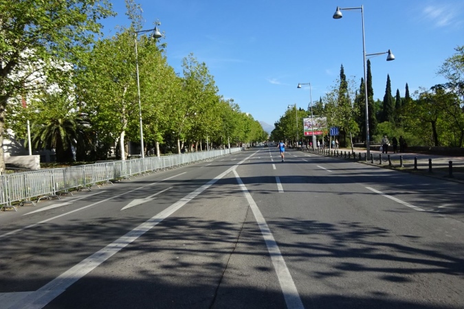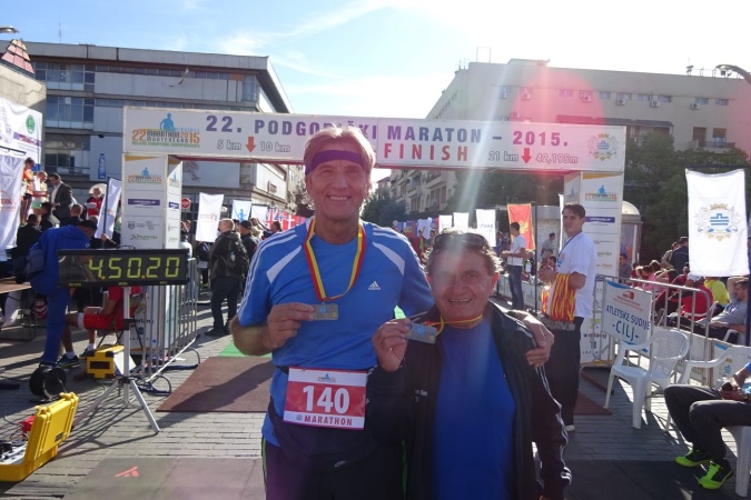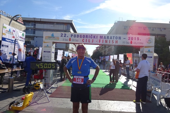 Ich komme dem Zentrum von Podgorica näher, der Kurs führt über die Union Bridge erneut über die Morača, auf der auch Kanuten trainieren. Inzwischen hat mich ein Läufer in gelbem Shirt von einem Fahrradfahrer begleitet, überholt – Doris liegt noch zurück. Der Marathonkurs führt wieder zur Milleniumsbrücke. Die nun folgende Schleife zurück zum Platz der Republik gleicht einem jeweils auf einer Seite offenen Achter – der Kurs führt auf dem letzten Kilometer auf den gleichen Straßen wie am Beginn des Marathons ins Ziel. Ich blicke mich um, ein weiterer Oldie, angefeuert von seiner Frau, die ihm auf Finnisch etwas zuruft, überholt mich 500 Meter vor dem Ziel. Und auch Doris hat ihre Kräfte mobilisiert und liegt nur mehr 200 oder 300 Meter hinter mir. Dem Finnen rufe ich auf der kurzen Begegnungsstrecke einen „hyvää iltapäivää“ zu, was er mit einem Grinsen quittiert, einholen kann ich ihn auf den 300 Metern bis ins Ziel nicht mehr. Vielleicht wollte Doris mich vor dem Finish noch erwischen, es gelingt ihr leider nicht.