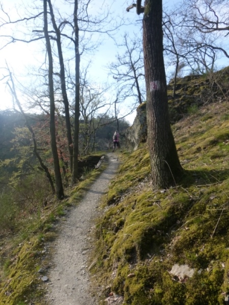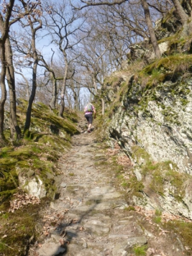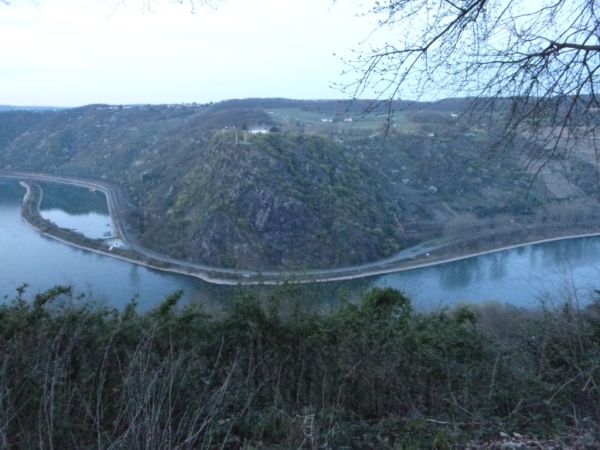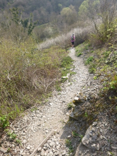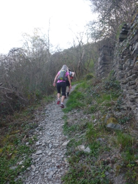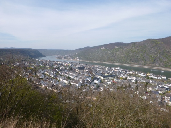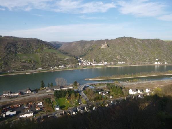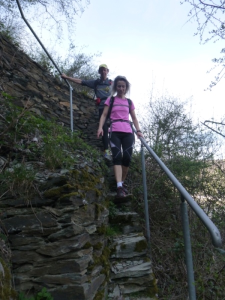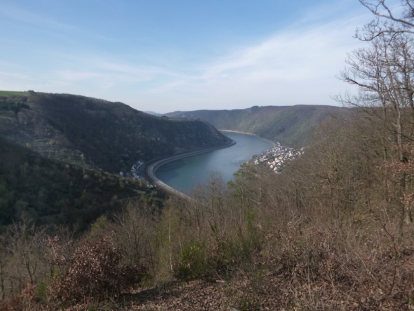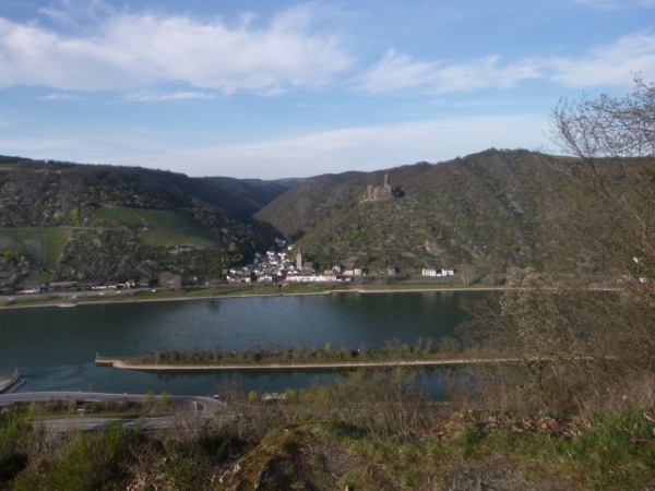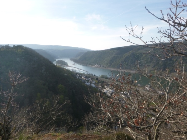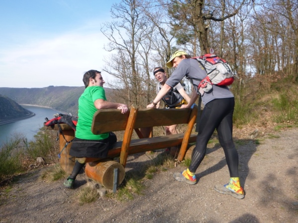 Nach links ging es über einen steilen, zum Teil abgerutschten, alpinen Zickzack-Weg hinunter nach Hirzenach (km 36,9). Am Baum heftete eine Karte, auf der die Wegsperrung und der vorgeschlagene Umleitung eingezeichnet waren. Wir entschieden uns für den steilen, deutlich kürzeren Abstieg, der bei den heutigen, optimalen Bedingungen keine größeren Schwierigkeiten darstellen sollte. Einen knappen Kilometer am Rhein liefen wir durch Hirzenach, bevor wir dann erneut auf dem Eselspfad aufstiegen und zur Belohnung einen beeindruckenden Ausblick auf Kestert und das Rheintal genießen konnten. Kurz hinter Holzfeld (km 40,1) konnten unsere Blicke über die Taunus-Hügel schweifen. Ein bunter Wechsel zwischen Wald- und Schotterwegen, durch Wiesen und Felder oder aber entlang der Felskante auf schmalen Pfaden machte diesen Streckenabschnitt durchs Heimbachtal besonders interessant.