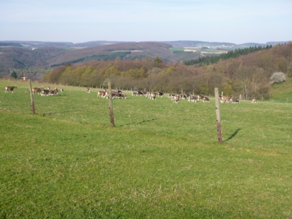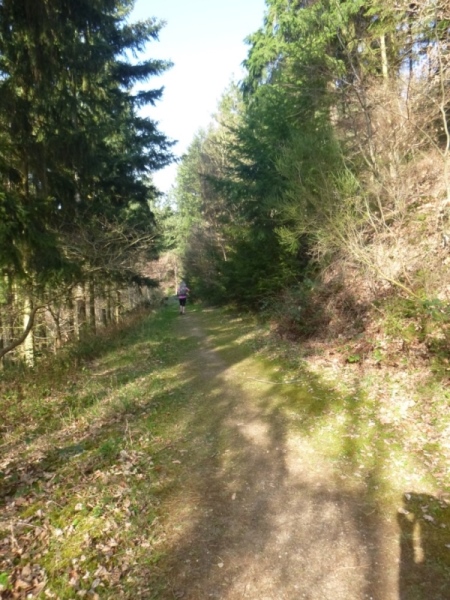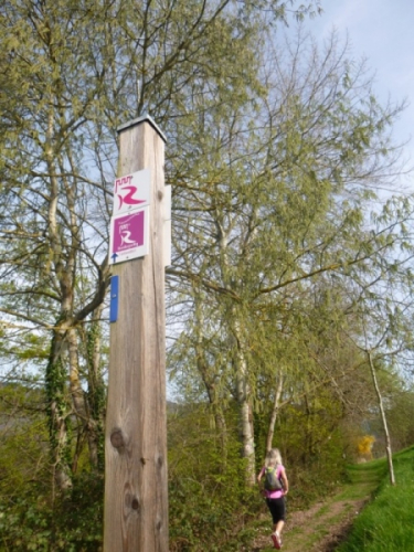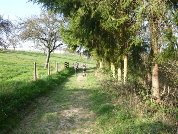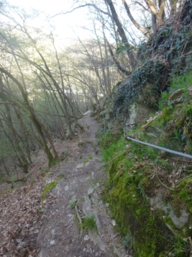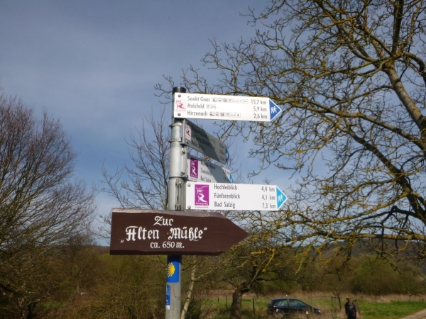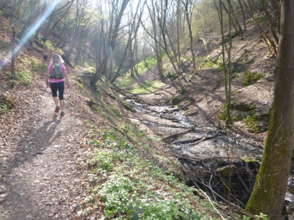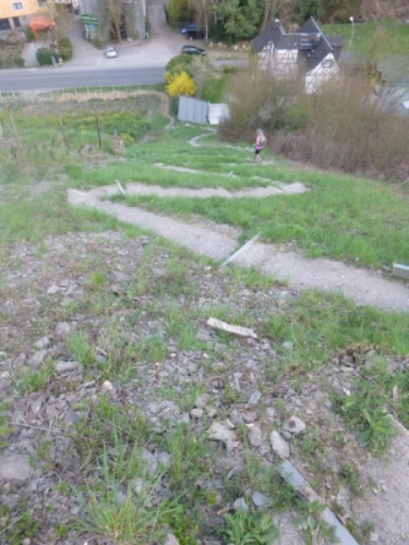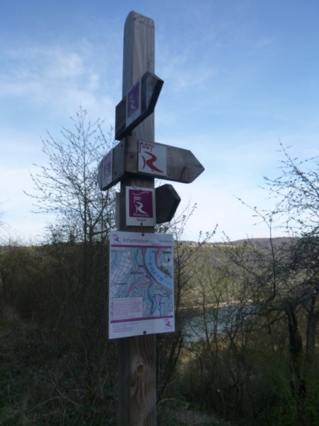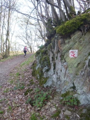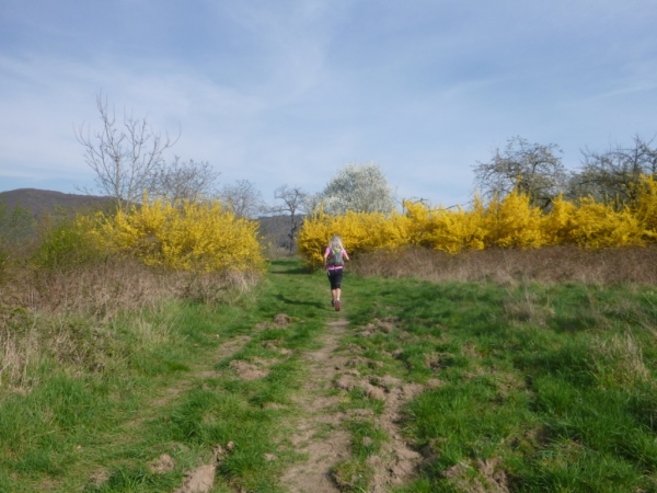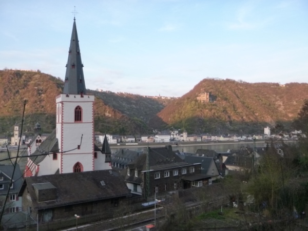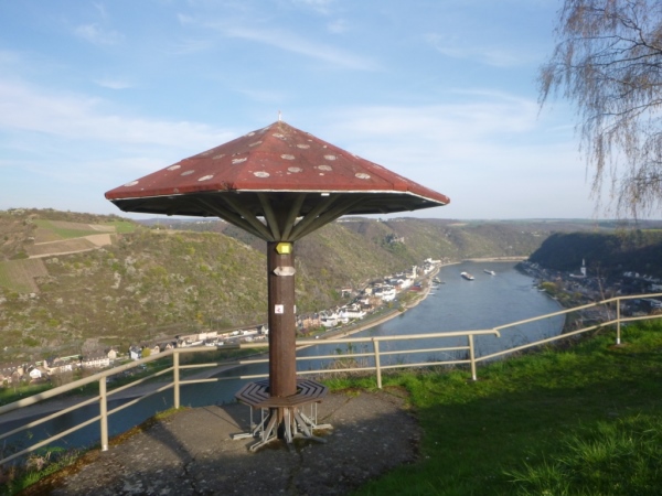 Nach links ging es über einen steilen, zum Teil abgerutschten, alpinen Zickzack-Weg hinunter nach Hirzenach (km 36,9). Am Baum heftete eine Karte, auf der die Wegsperrung und der vorgeschlagene Umleitung eingezeichnet waren. Wir entschieden uns für den steilen, deutlich kürzeren Abstieg, der bei den heutigen, optimalen Bedingungen keine größeren Schwierigkeiten darstellen sollte. Einen knappen Kilometer am Rhein liefen wir durch Hirzenach, bevor wir dann erneut auf dem Eselspfad aufstiegen und zur Belohnung einen beeindruckenden Ausblick auf Kestert und das Rheintal genießen konnten. Kurz hinter Holzfeld (km 40,1) konnten unsere Blicke über die Taunus-Hügel schweifen. Ein bunter Wechsel zwischen Wald- und Schotterwegen, durch Wiesen und Felder oder aber entlang der Felskante auf schmalen Pfaden machte diesen Streckenabschnitt durchs Heimbachtal besonders interessant.