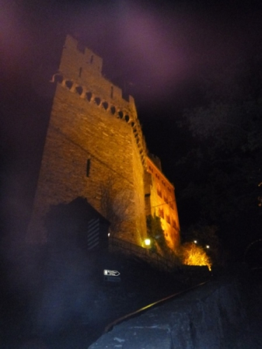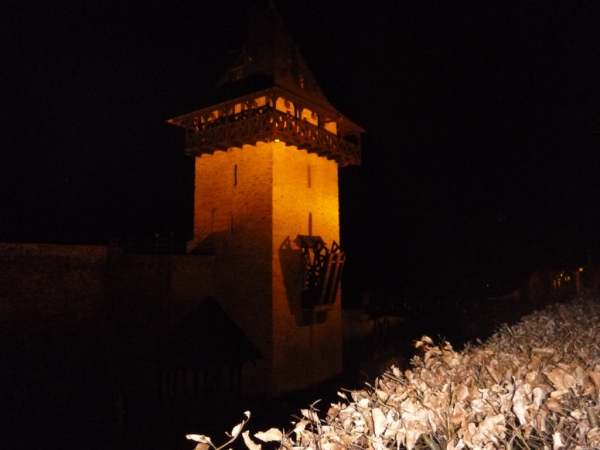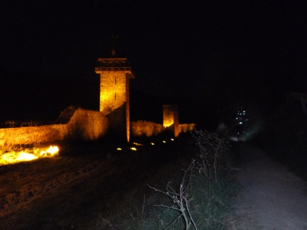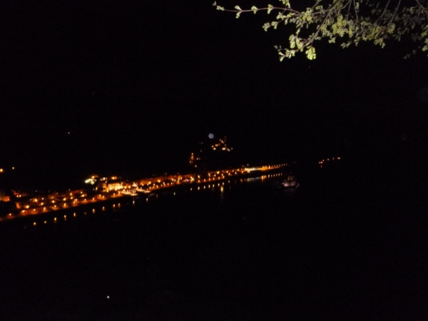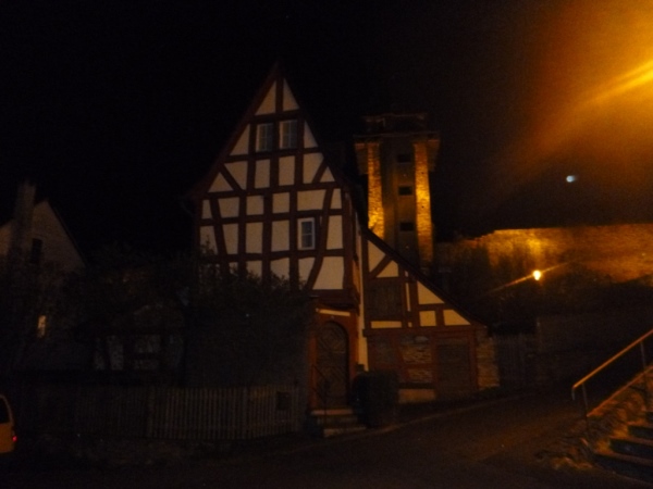 Nach der kleinen Klettereinlage ging es auf einem Weinbergweg hinunter zum Rhein nach Oberwesel (km 57,0), dessen Fachwerkhäuser auch im Laternenlicht nett anzuschauen waren. Besonders beeindruckend war der Weg entlang der Stadtmauer von Oberwesel, bis wir den Felsenpfad Elfenlay hinauf zur Schönburg erreichten. Auf der gegenüberliegenden Rheinseite leuchteten die Straßenlichter von Kaub, sonst konnten wir bei Nacht nun nicht mehr viel erkennen. Das Sichtfeld blieb weitgehend auf den Lichtkegel der Stirnlampen beschränkt und so beleuchteten wir auch in erster Linie unseren Weg, um nicht zu stolpern. Die Strecke bis Bacharach war ein bunter Wechsel aus Wald- und Wiesenwegen. Nachdem wir uns in Bacharach (km 71,6) erneut auf Rheinniveau befanden, wartete auch schon der nächste Aufstieg auf uns, hinauf zur Burg Stahleck, an der der RBW vorbei führte. Nur noch ein steiler Kilometer trennte uns von der dritten und letzten VP (km 72,5), wo neben vielen Leckereien auch die Drop-Bags für uns bereit lagen.