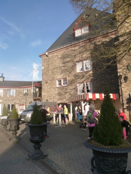 Neben einer Fahrstraße befand sich nun der RBW-Trail etwas oberhalb, bis wir die Straße kreuzten, um noch einmal in engen Serpentinen nach Bingen hinunterzulaufen. Kurz vorm Bahnhof überquerten wir die Nahe und hatten auch schon das Ziel des RBWs passiert. Nur knapp 2 Kilometer waren es noch hinauf zur Gymnastikhalle der Grundschule an der Burg Klopp. Es war bereits 5 Uhr morgens und bald würde der neue Tag anbrechen. Wir nutzten die Zeit für eine warme Dusche und frische Kleider, legten uns noch eine Stunde in der Halle zum Schlafen nieder. Allerdings konnten wir uns nur etwas ausruhen, da nach und nach weitere Läufer in der Halle ankamen, die sich über das erreichte Ziel freuten.
