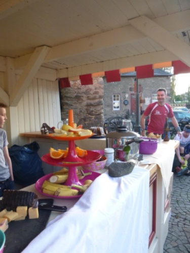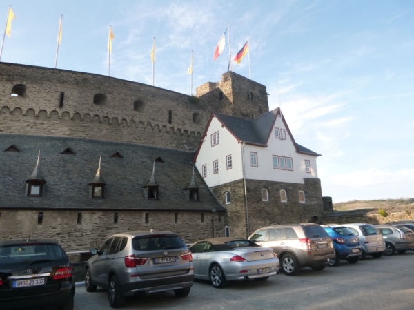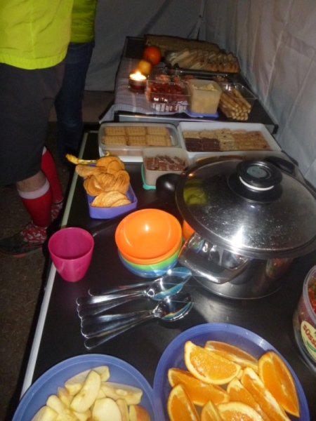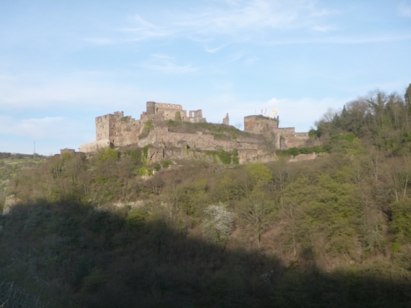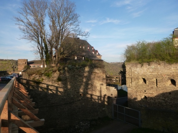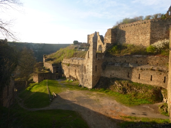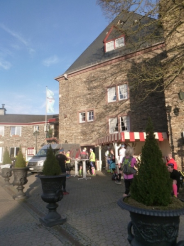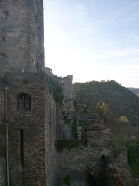 Bereits von weitem konnten wir den zweiten Verpflegungspunkt auf der Burg Rheinfels (km 49, 8) erkennen. Doch zwang uns erneut ein Seitental zu einem steilen Serpentinenabstieg und natürlich genauso gnadenlos steil ging es auf der anderen Seite wieder hinauf zur Festungsanlage, die oberhalb von St. Goar lag. Die Sonne stand bereits tief über den Hügeln des Rheins, die Luft kühlte allmählich ab. Auch wenn es erst kurz vor 18 Uhr war, empfanden einige Läufer ein leichtes Frösteln zwischen den Mauern der Burg Rheinfels. Viele nutzten die Pause, um von der Vielfalt der angebotenen Leckereien zu probieren, die Wasservorräte aufzufüllen und sich lange Hosen und Shirts anzuziehen.