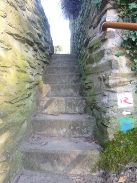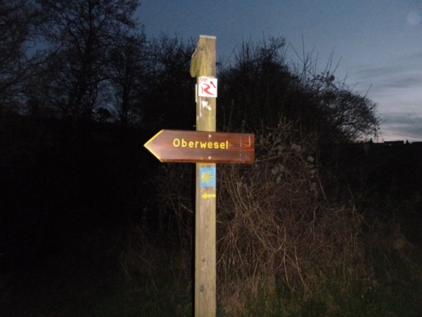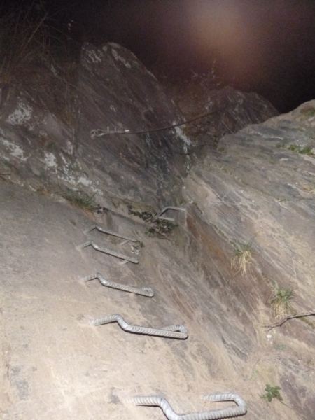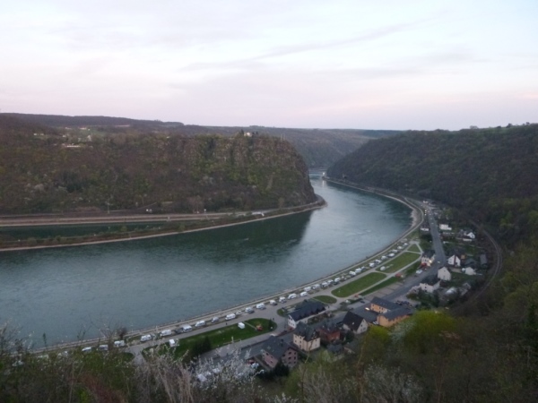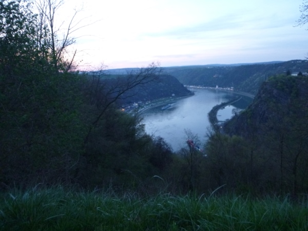 Entlang der Uferpromenade und der Stadtmauer von St. Goar führte der RBW nun zur wohl bekanntesten Sehenswürdigkeit am Rhein, der Loreley. Unverkennbar ragt der Loreleyfelsen steil empor und das Rheintal wirkt von oben gesehen besonders eng und verwunden. Auch der Wanderweg auf teils grasbewachsenen Naturwegen direkt an der Abrisskante zum Rheintal machte richtig Spaß. Bald erreichten wir die Weinberge von Oberwesel mit vielen steilen Abschnitten, gefolgt von einem kurzen Klettersteig, dem Oelsberg-Klettersteig (km 55,0). In die Felsen gehauene Eisentritte und eine senkrechte Leiter brachten uns den Hang hinunter. Die weniger steilen Wegabschnitte waren zum Teil mit Stahlseilen zum Festhalten gesichert. Kurz bevor wir auf diesen anspruchsvollen Wegabschnitt kamen, machten wir Halt, um unsere Stirnlampen aufzusetzen. Noch war es nicht ganz dunkel, aber es würde nicht mehr lange dauern, bis wir ohne Stirnlampenlicht nichts mehr sehen und die vielen kleinen Stolperfallen übersehen würden.
