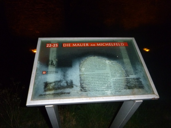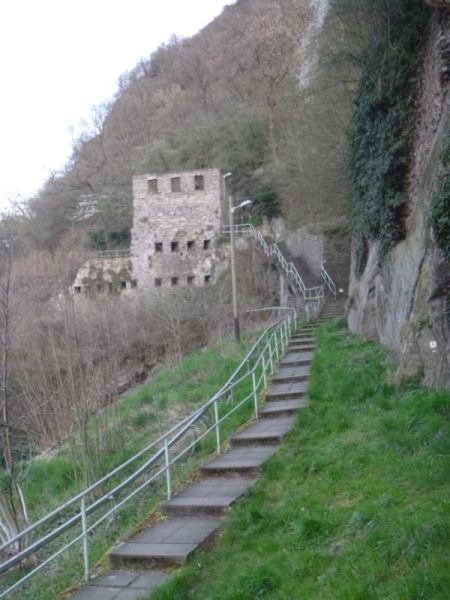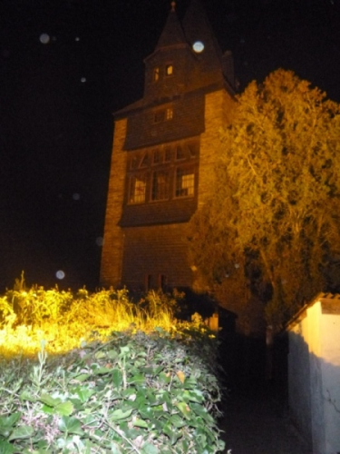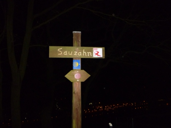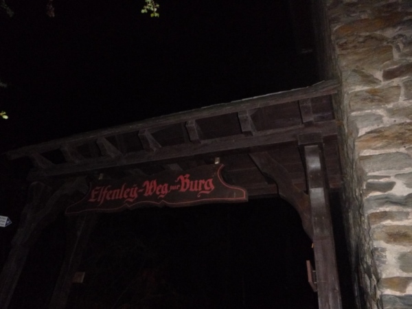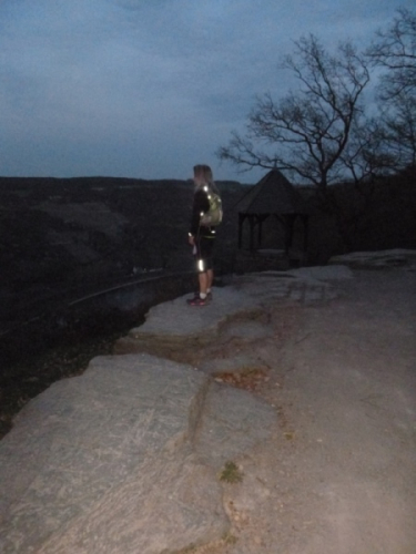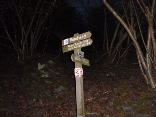 Am Ende des Morgenbachtals kamen wir wieder zum Rhein bis zur Burg Rheinstein (km 94,6). Leider waren die Burgen bei Nacht nicht beleuchtet, so dass wir sie auch oft nur schemenhaft erkennen konnten. An der Wegkreuzung „Schweizer Haus“ waren wir zuerst etwas unsicher, welchen Weg wir nehmen sollten. Der kürzere Weg nach Bingen wäre 6 Kilometer gewesen und führte auf direktem Weg entlang des Rheins ins Ziel. Doch wir wollten den RBW komplett laufen und so mussten wir der Wegmarkierung folgend erneut ins Morgenbachtal und dann zur Steckeschlääferklamm laufen. Immer wieder irritierten die Schilder mit der Markierung „Soonwaldsteig“. Doch dann war wieder alles klar! Leicht ansteigend zog sich der Weg entlang des Morgenbachs über mehr als 3 Kilometer weg vom Rhein. An der Steckeschlääferklamm (km 98,3) mussten wir die Klamm hinauf steigen, bei Dunkelheit mit Stirnlampe nicht ganz einfach. Doch ab hier ging es in großen Schritten unserem Ziel in Bingen entgegen.