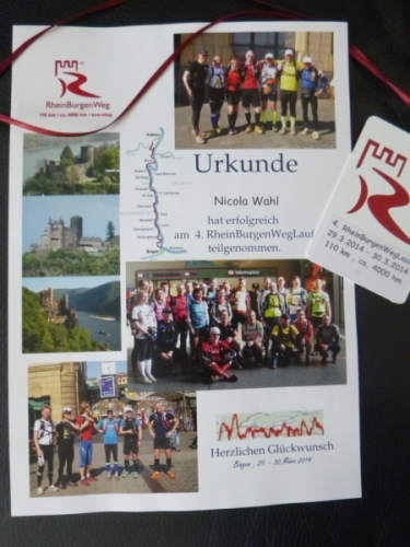 Achim und Tom hatten für 9 Uhr (Sommerzeit) ein Frühstücksbuffet für die gesamte Laufgruppe im Café Rheinblick organisiert, von wo wir einen wunderschönen Rundblick auf den Rhein genießen konnten. So lagen der Mäuseturm zur Linken, die Weinbergen auf der gegenüberliegenden Rheinseite und das Niederwalddenkmal zur Rechten direkt vor uns. Zum Abschluss dieses Gruppenlaufes richtete Tom noch ein paar nette Worte an die anwesenden Läufer und überreichte uns eine Erinnerungsurkunde und das RBW-Schild mit Aufkleber. Stolz nahmen wir Läufer dieses Geschenk an und ich glaube, dass viele Teilnehmer auch im nächsten Jahr beim RheinBurgenWegLauf dabei sein werden.