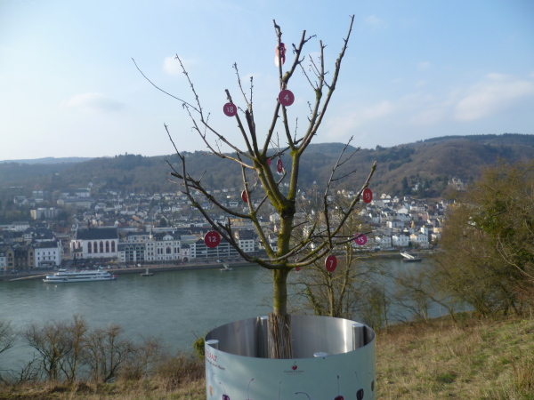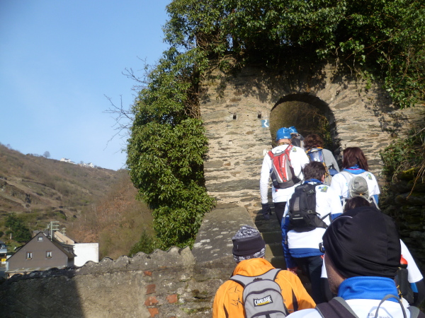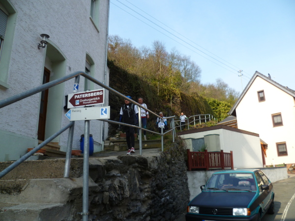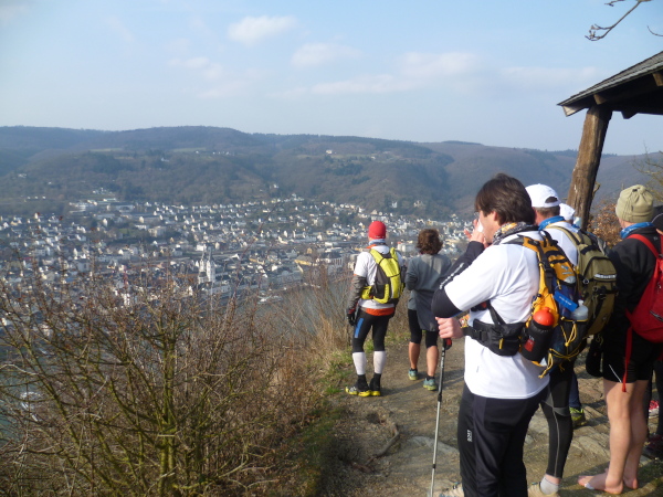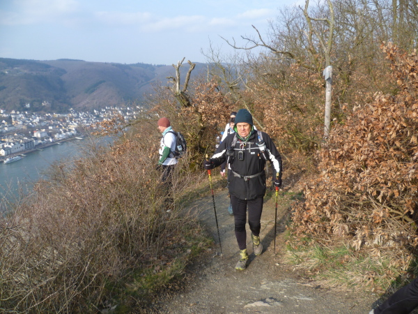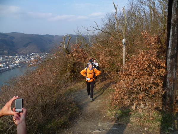 Wir haben einen tollen Blick auf den Rhein und Boppard auf der anderen Rheinseite. Es geht 5 km gleichmäßig ansteigend dahin. Einmal hätten wir fast den Abzweig verpasst. Gut, dass doch immer einer aufpasst.