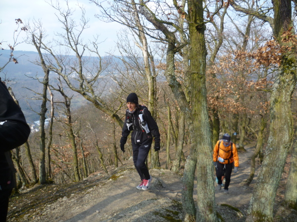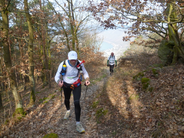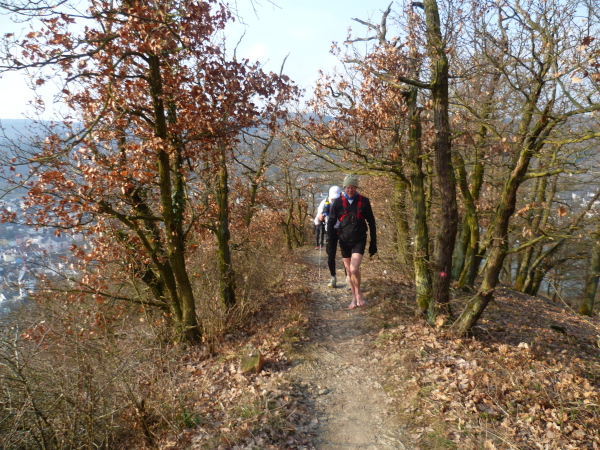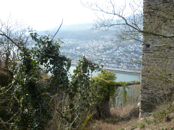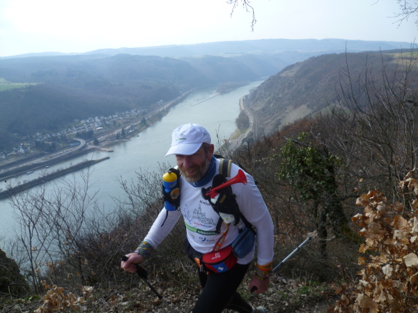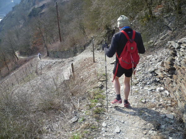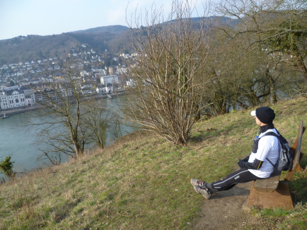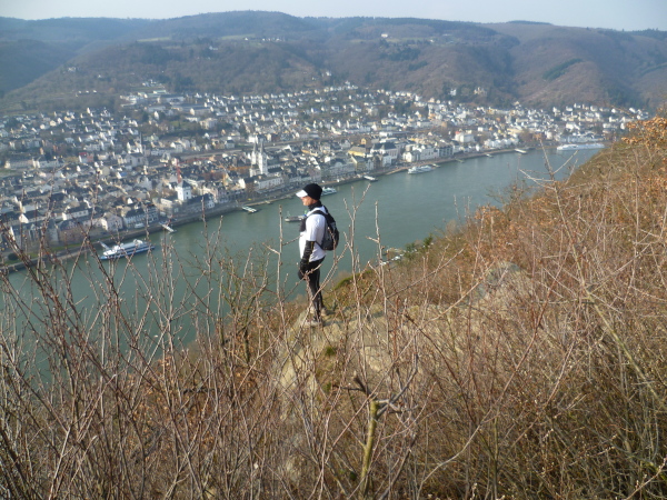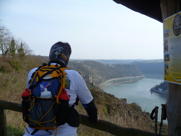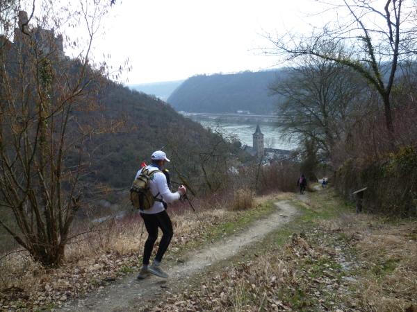 Das kann man nicht toppen und so geht es jetzt erst mal 3 Kilometer bergab. Um die Beinmuskeln gleichmäßig zu belasten, geht es daraufhin aber wieder steil bergauf. Das Streckenprofil wird jetzt wellig; immer wieder öffnen sich faszinierende Ausblicke auf das enge Tal des Rheins.