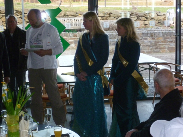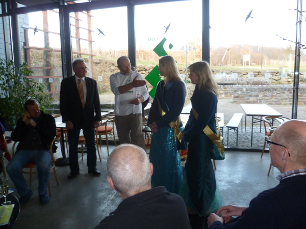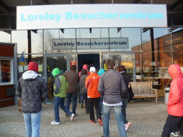 Es ist Kurz nach halb sechs. In einer knappen Stunde geht es zum Loreley Besucherzentrum, dem nächsten offiziellen Termin. Aber wir schaffen es sogar noch, vorher einen Kaffee zu trinken. Pünktlich machen wir uns auf den unwegsamen Abstieg zum 1 km entfernten Loreley Besucherzentrum. Dort werden wir bereits von Presse und offiziellen Gemeindevertretern erwartet. Auch die Loreley Julia und die seit 2012 zum ersten Mal gewählte Loreley-Nixe Juliane geben sich die Ehre. Außerdem gibt es einen Sektempfang. Trotz sicherlich vorhandener Müdigkeit wollen alle noch den 3-D Film über das Weltkulturerbe Oberes Mittelrheintal sehen. Da das Besucherzentrum bereits offiziell geschlossen hat, findet für uns eine Sonderschau statt.