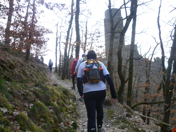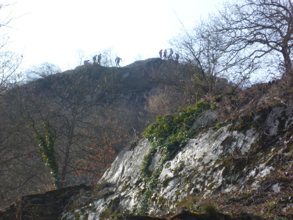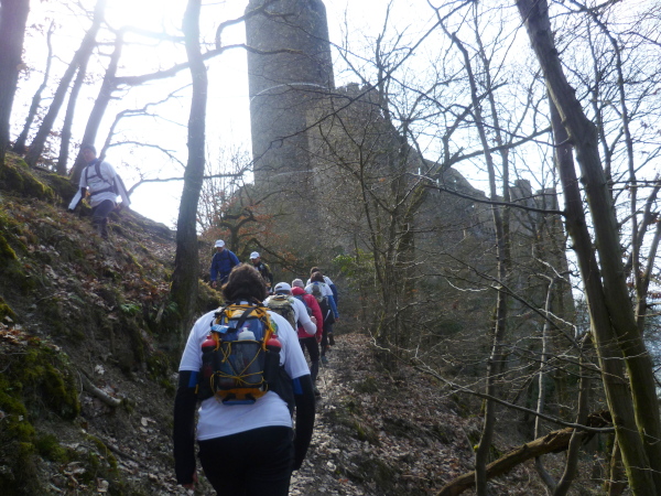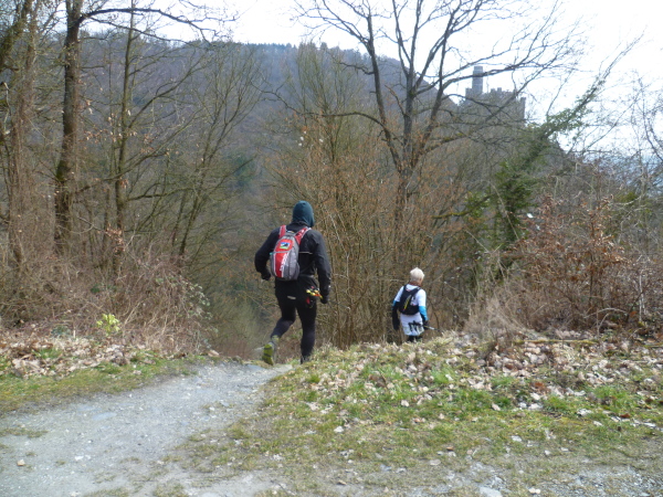 Den Serpentinen folgend machen wir uns an den Aufstieg zur Burg Maus. Schnell erreichen wir das alte Gemäuer. Aber Moment mal, es geht ja schon weiter! Wir laufen daran vorbei immer noch den Berg hinauf. Bald liegt die Burg tief unter uns.