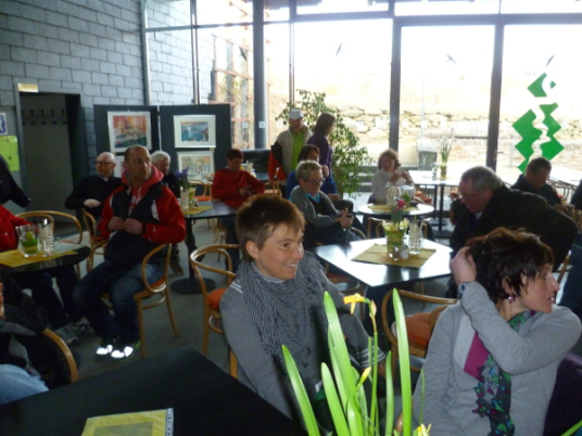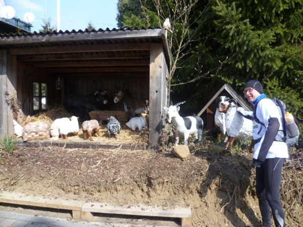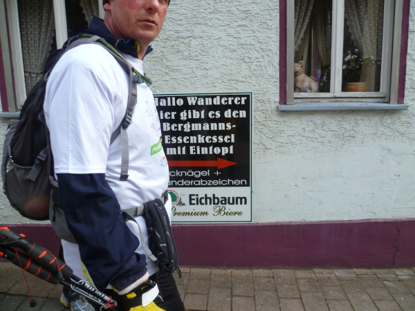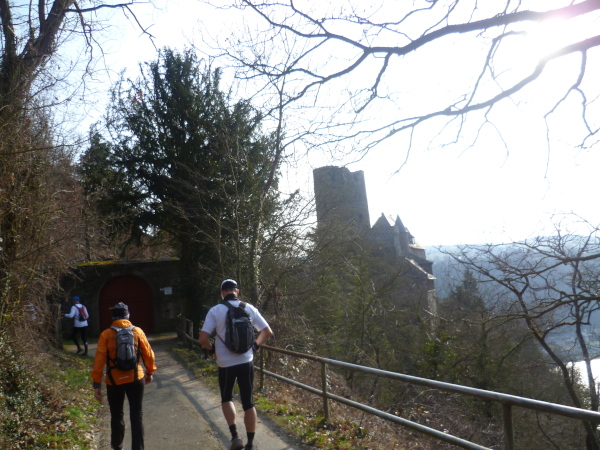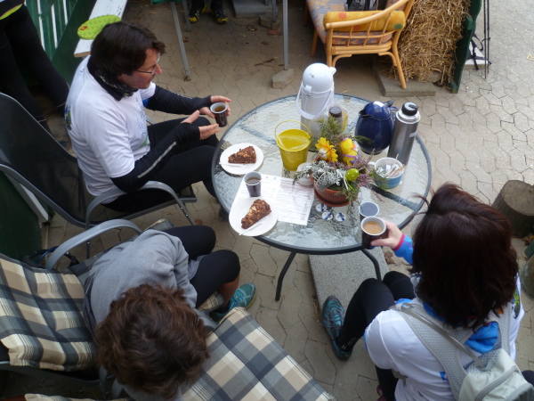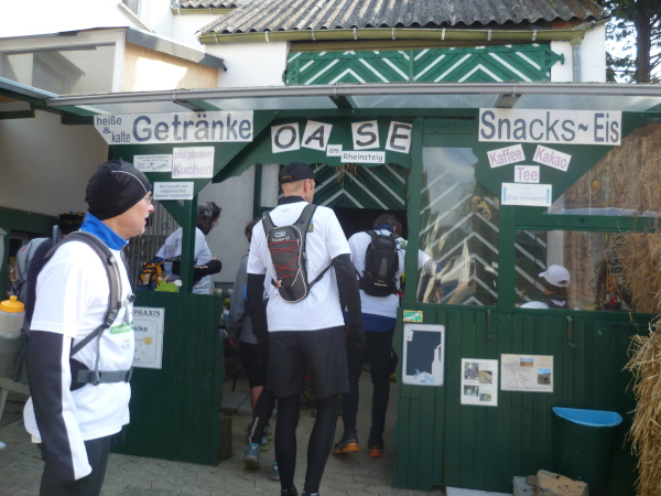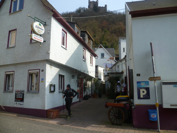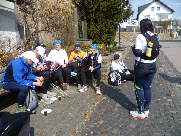 Ich bin schon ziemlich müde, da zieht das Tempo der Gruppe plötzlich an. Einer meint, dass die Plätze in der "Oase" begrenzt seien und wer zuletzt kommt, müsse stehen. Ich verstehe nur "Pause" und das genügt um mich zum Laufen zu motivieren. Wir erreichen den kleinen Ort Lykershausen. Marion und Harald Selke haben ihr Haus tatsächlich zur "Oase am Rheinsteig" gemacht. Gottseidank benötigt von uns keiner die Dienste der diplomierten Heilpraktikerin Marion. Aber ihrem leckeren Kuchen ist keiner abgeneigt. Auch Kaffee und Kinderpunsch finden reichlich Absatz. Es herrscht tatsächlich Platzmangel, so dass sich die Hälfte der Gruppe auf der anderen Straßenseite auf einer Mauer in die Sonne setzt. Es gibt so gut wie keinen Verkehr hier, was die Idylle perfekt macht.